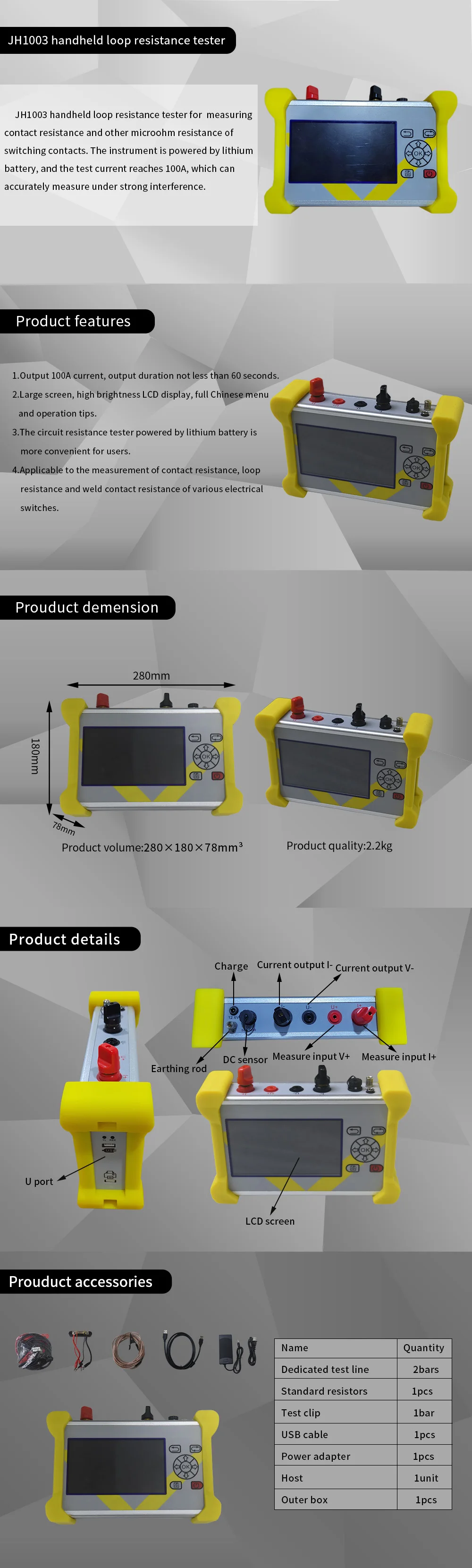 JH1001 Ручной тестер сопротивления петлиВ основном используется для контактного сопротивления контактов переключателей и другого измерения сопротивления микроом, а скорость испытания Высокая, а точность высокая. Этот портативный тестер контактного сопротивления-это инновационный продукт, компактный, портативный, с батарейным питанием и удобный для переноски.