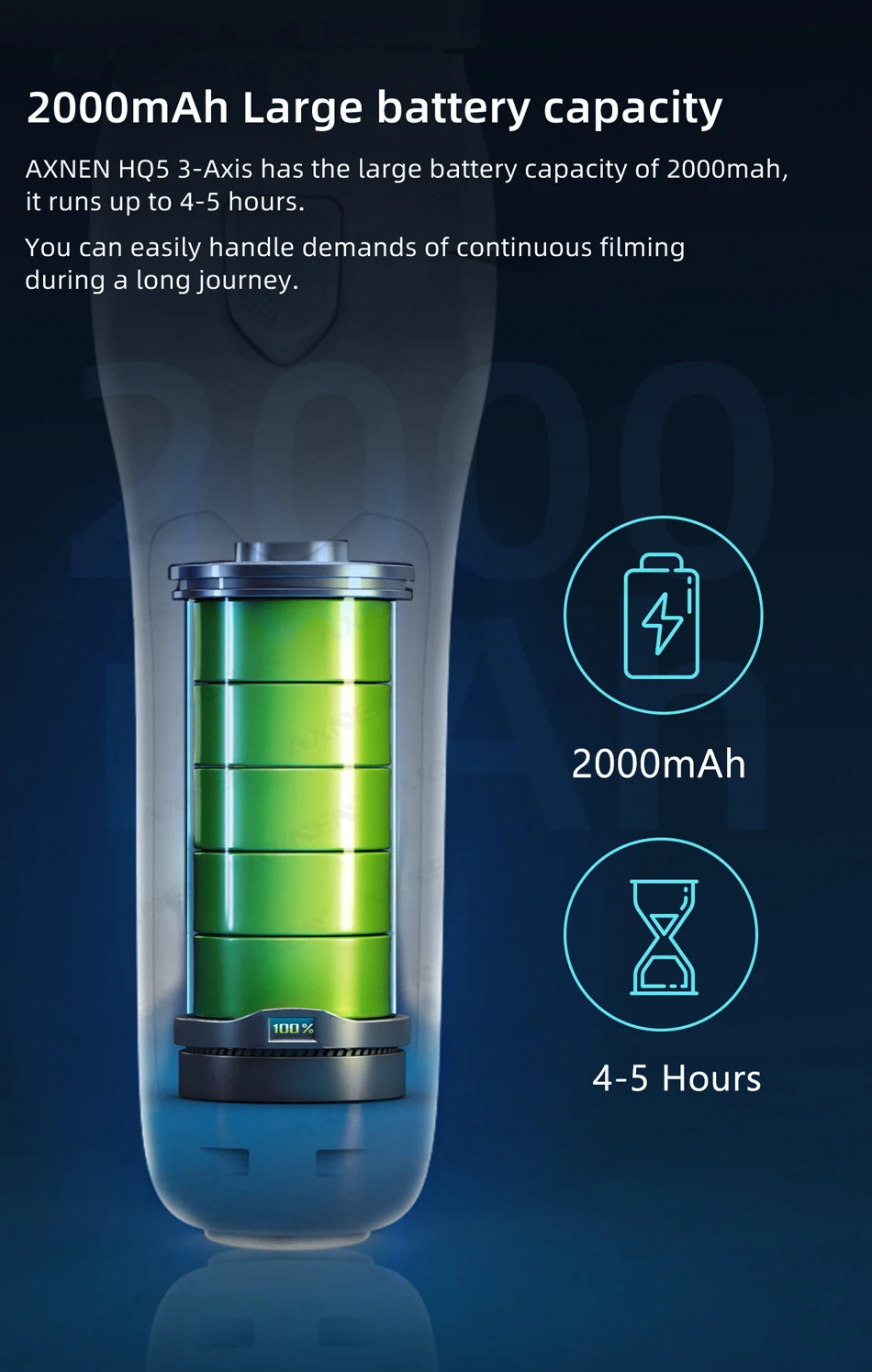 AXNEN HQ5 имеет большую емкость аккумулятора 2000 мАч, он работает до 4-5 часов. Вы можете легко справиться с требованиями непрерывной съемки во время долгого путешествия.