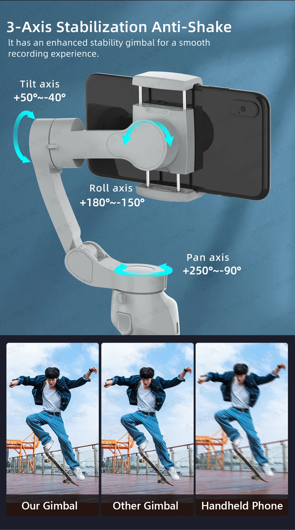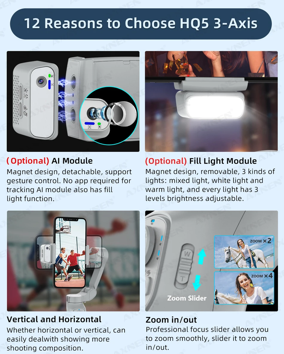 2023 НОВЫЙ AXNEN HQ5 3-осевой ручной карданный стабилизатор Штатив для селфи с зумом/отслеживанием лиц/отслеживанием объектов, для смартфона iPhone Android, дополнительный модуль AI Fill Light, VS HQ3