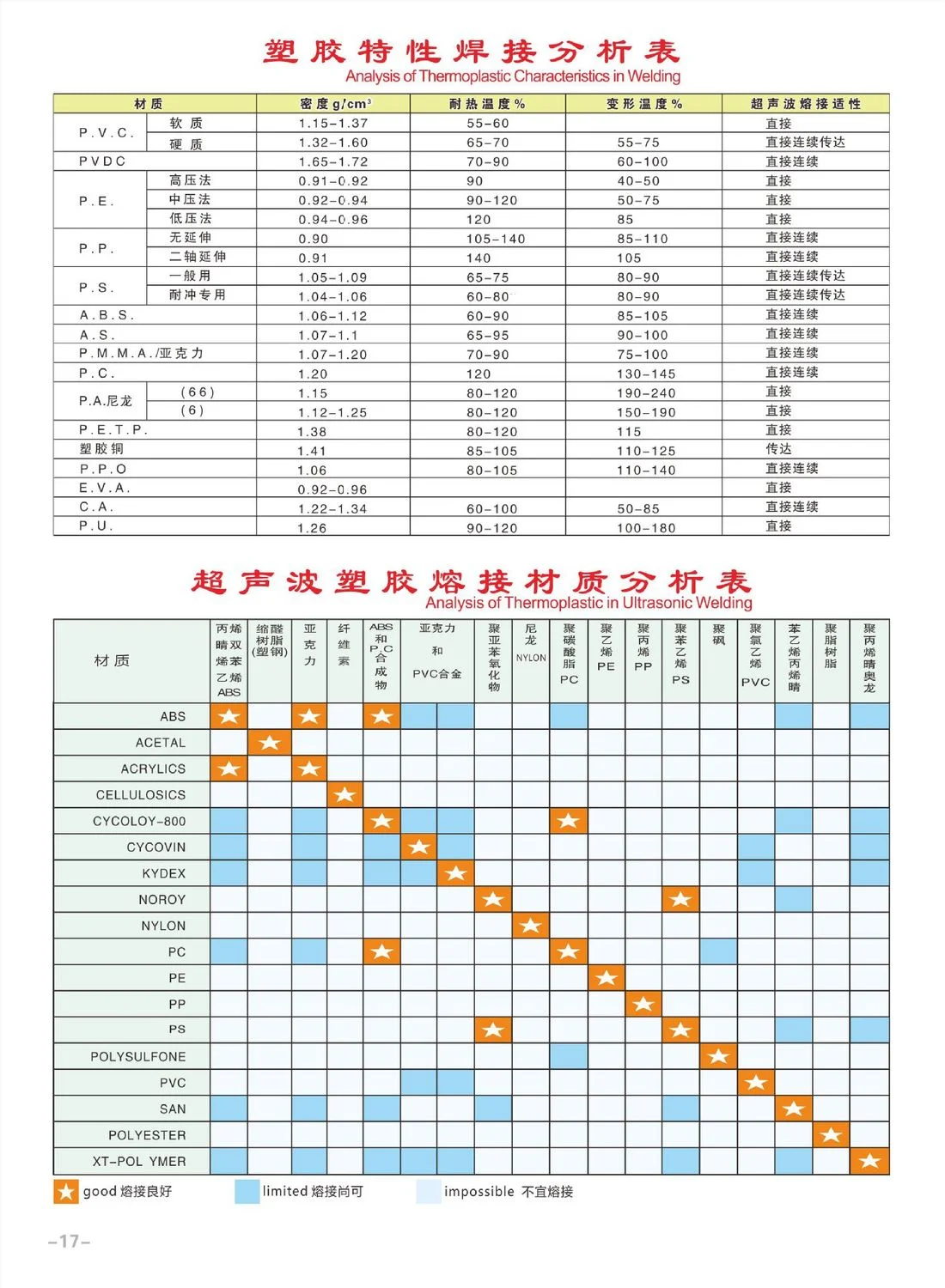 Наши ультразвуковые генераторы могут быть профессионально использованы в различных пластиковых и нетканых материалов сварки. Используется в автомобильной промышленности, игрушечной промышленности, индустрии аккумуляторных батарей и т. д. типы пластмасс, которые могут быть сварены, перечислены на рисунке.