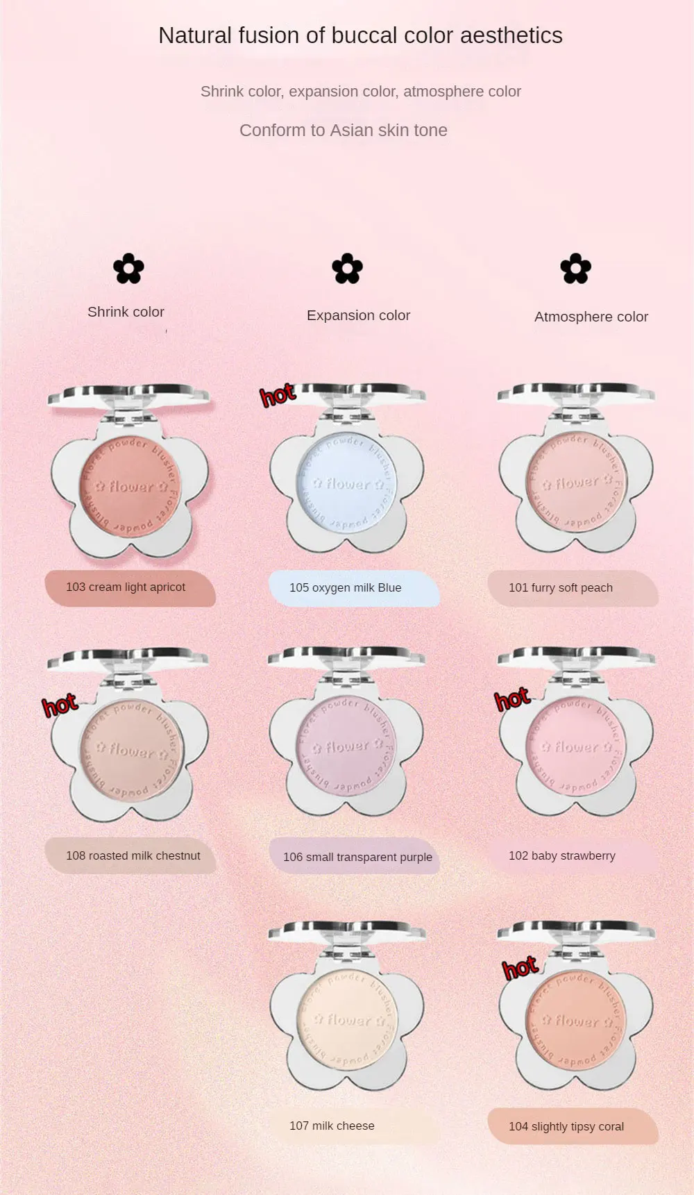 4. Специальный Цвет: блестящий цвет. При выборе тона румян очень важно предпочтение цвета, но также важно убедиться, что он может дополнить базовый цвет кожи (теплый или прохладный).