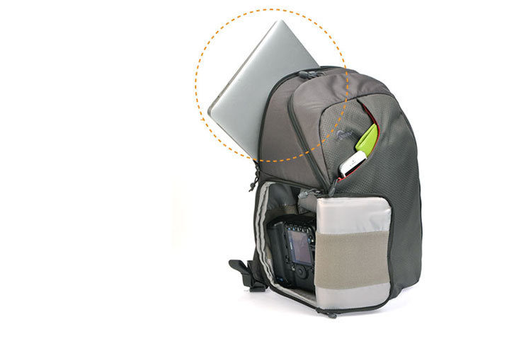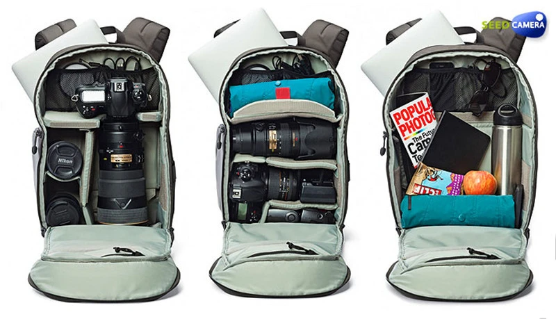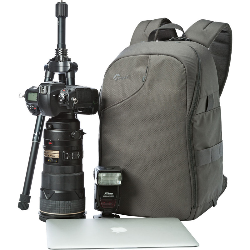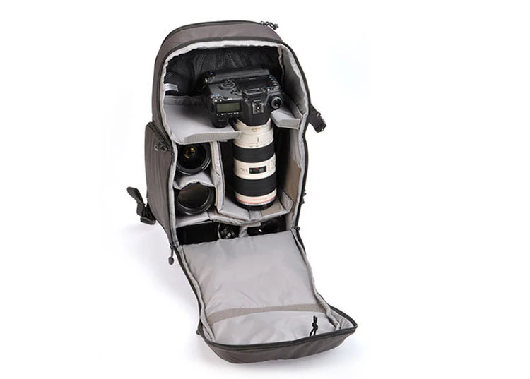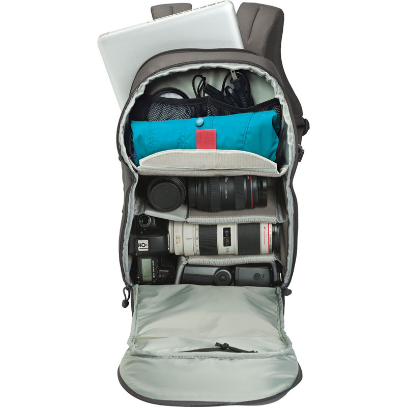 Сланцевом серомТранзитный рюкзак 350 AWОт-универсальная Дорожная сумка из атмосферостойкого полиэстера 600D. Он может вместить DSLR с объективом 70-200mm f/2,8 или 300mm f/2,8, двумя дополнительными объективами, вспышкой и аксессуарами, включая компактный штатив. В задней части рюкзака также есть специальное отделение, в котором можно разместить большинство 15-дюймового ноутбука.