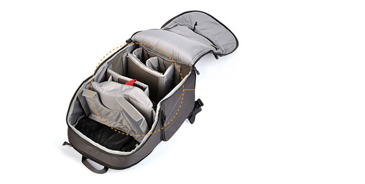 Модульная система внутреннего делителя UltraFlex позволяет выбрать одну из двух конфигураций отсека для вашего фотооборудования в сумке. Первый-это вариант с двумя отсеками с отдельной верхней областью и областью основной камеры с быстрым боковым доступом к вашей зеркальной фотокамере с прикрепленным объективом размером 70-200 мм.