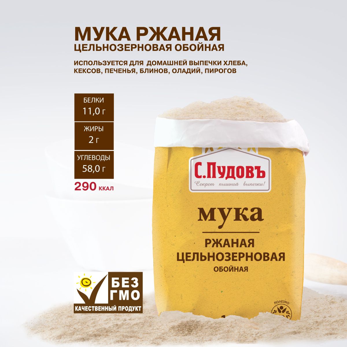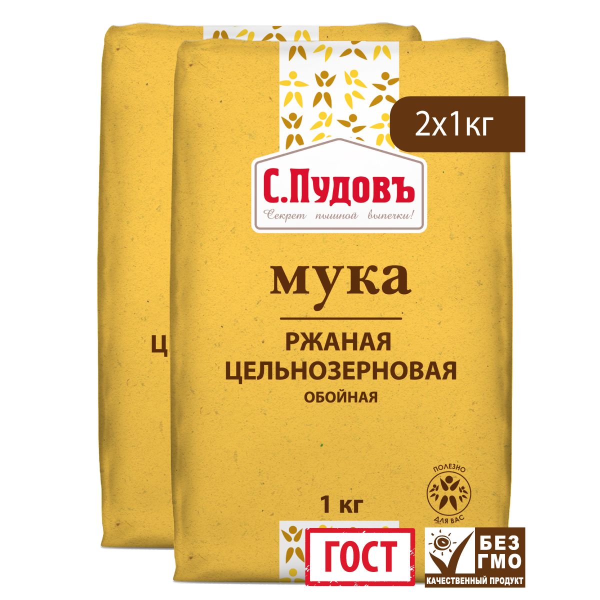 Ржаная мука С.Пудовъ "Обойная цельнозерновая", 2 шт по 1 кг