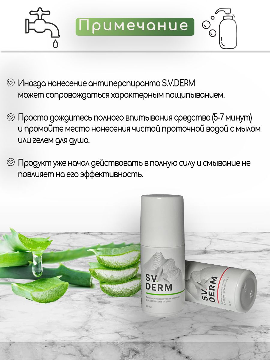Иногда нанесение антиперспиранта S.V.DERM может сопровождаться характерным пощипыванием. Просто дождитесь полного впитывания средства (5-7 минут) и промойте место нанесения чистой проточной водой с мылом или гелем для душа. Продукт уже начал действовать в полную силу и смывание не повлияет на его эффективность.