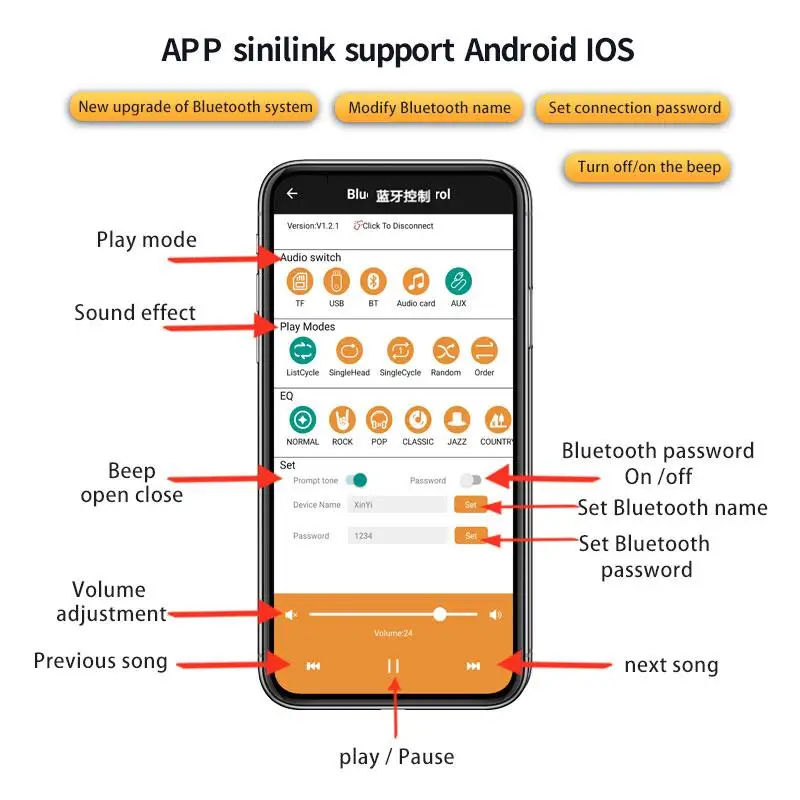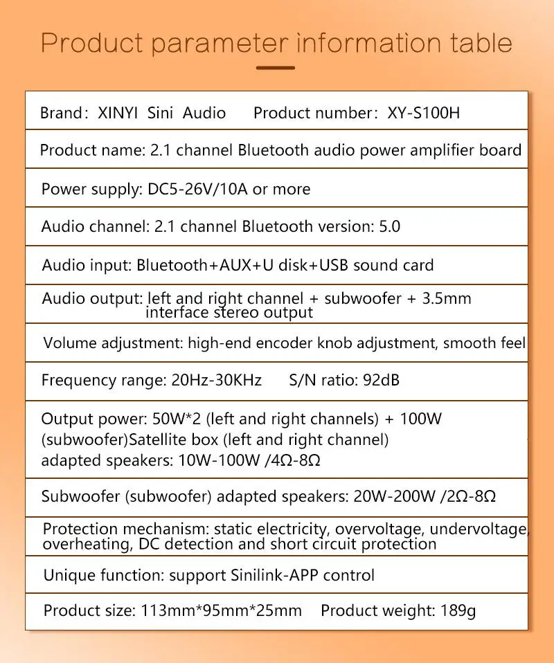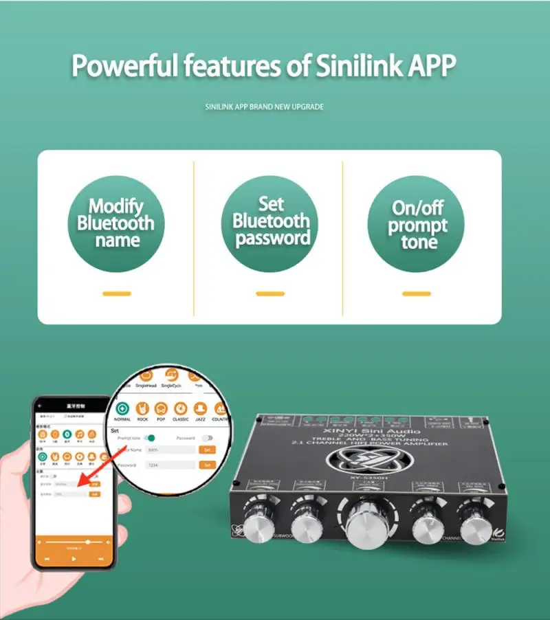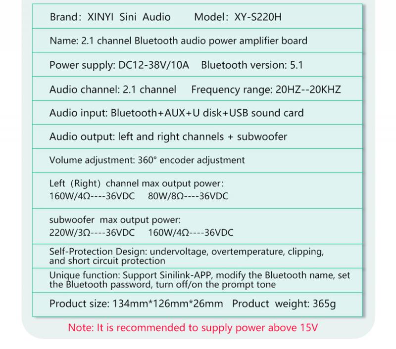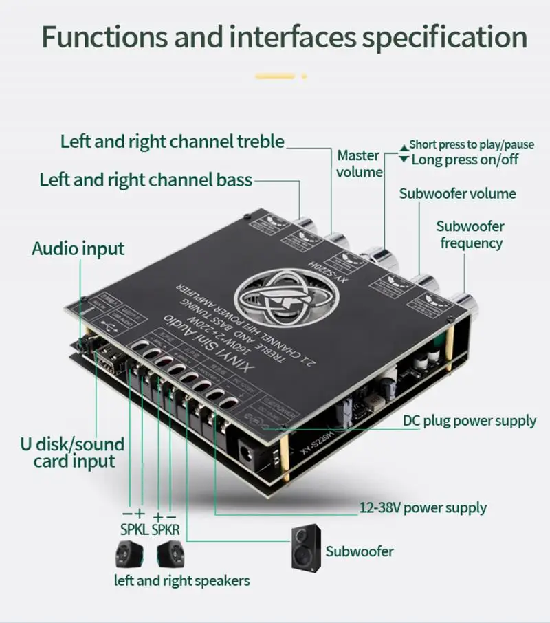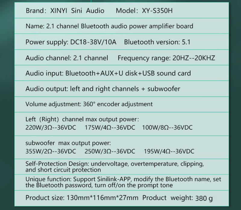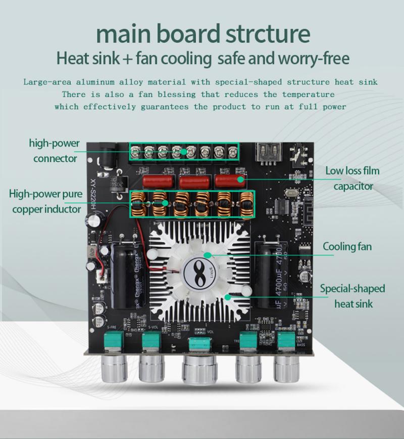 Это 2,1-канальный усилитель мощности с функцией Bluetooth 5,0 (без блокирующего сигнала в пределах 10 метров), сабвуфером + функцией стерео, которая может регулировать частоту и громкость сабвуфера отдельно. Отдельная регулировка частоты высоких частот стереоканала, регулировка частоты низких частот, регулировка громкости!