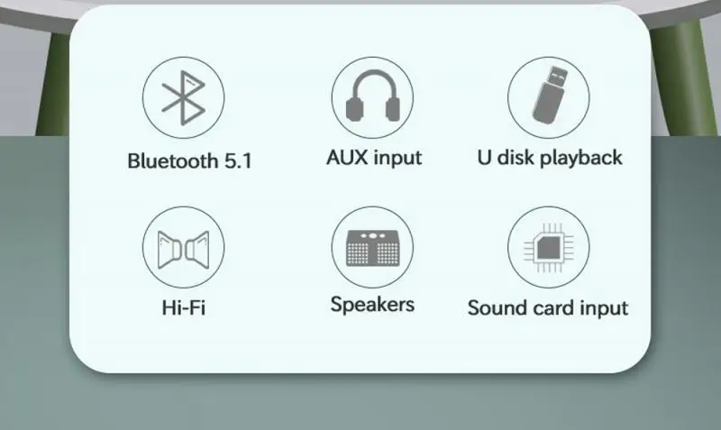 4. Аудиовход: Поддержка Bluetooth, аналогового сигнала AUX, U-диска/звуковой карты USB