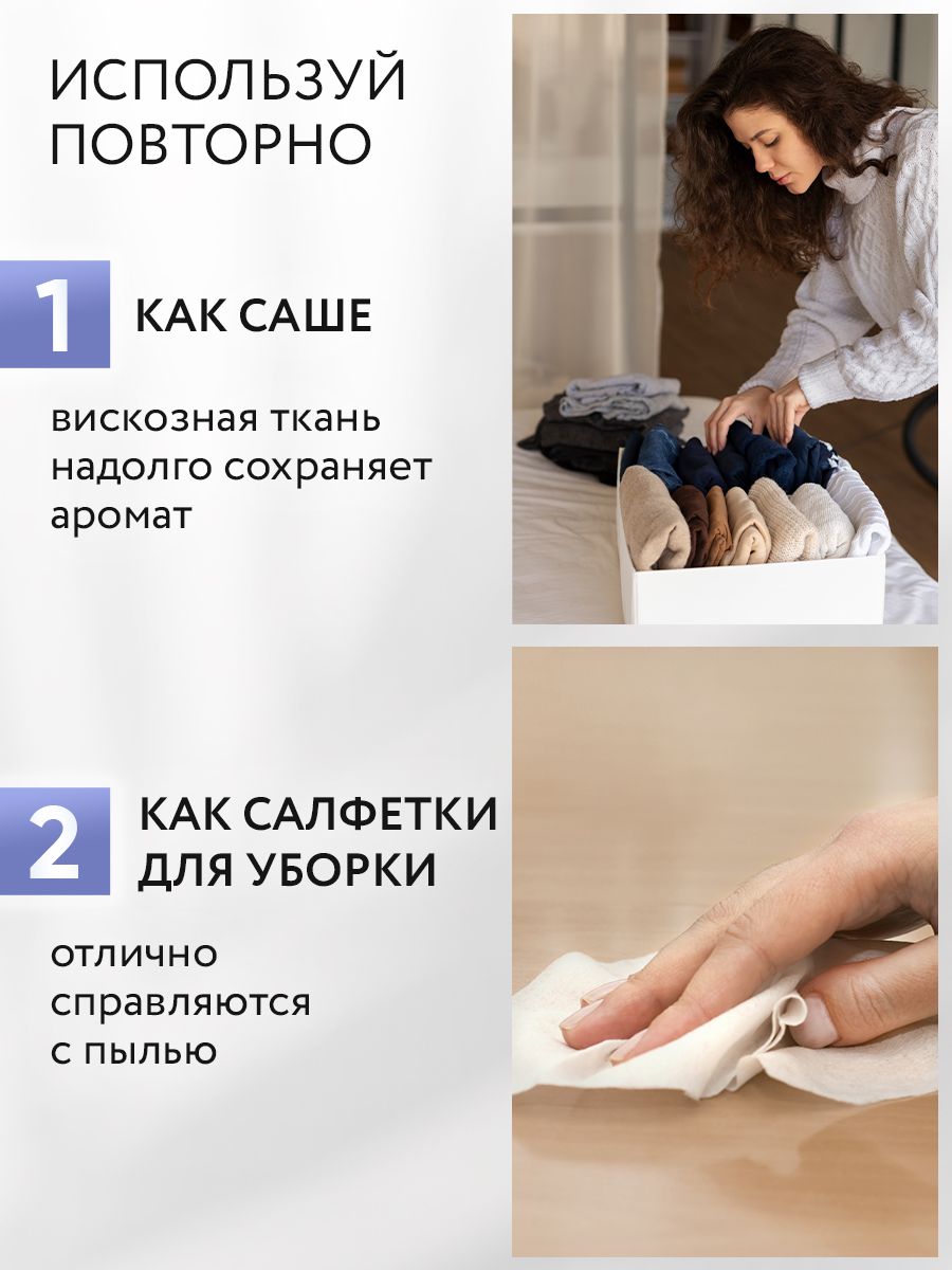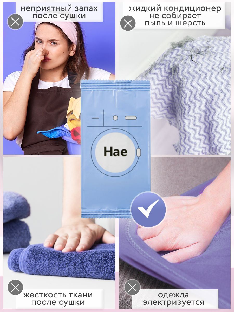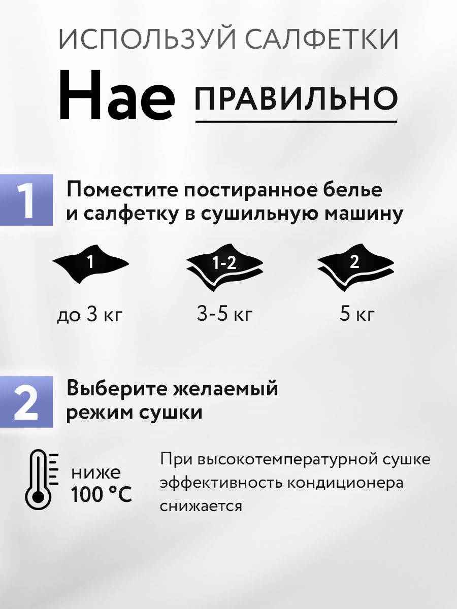 Описание: Салфетки для сушильной машины и автоматических стиральных машин с функцией сушки белья HAE сами по себе легкие, качественные, тонкие и действуют точно так же как и обычный кондиционер. Это отличный способ сохранить вещи свежими и мягкими надолго! Протестированы в стране производителя в Корее на гипоаллергенность. Не содержит усилителя белизны и изготовлена из экологически чистой вискозы. Ароматическая пропитка придает красивый аромат, который сохраняется на белье длительное время, поэтому их так же можно использовать в качестве саше для гардероба, обувного шкафа, спальни, гостиной. Смягчающие салфетки кондиционер защищают ткани от излишнего пересыхания, образования заломов и появления посторонних запахов в процессе сушки, прекрасная ароматизация, снимают статическое напряжение (электризуемость) и удаляют и остатки порошка. Если использовать подобные изделия, вещи будут намного меньше мяться и станет проще гладить утюгом. В основе отдушки - термостойкие цветочные эссенции. У корейских салфеток ХАЕ приятный парфюмерный и ненавязчивый цветочный аромат: цветочная поляна, морской бриз и жасмин. Салфетка безопасна для детского белья. Подходит для всех типов тканей, смягчает одежду, ароматизирует. Для однократного применения хватает 1-2 салфетки. 1 штука на 3 кг и меньше, 2 штуки на 3-5 кг и больше. Сушильные листы можно также использовать в качестве саше. Способ применения: 1) для машин общего назначения - загрузить в барабан вместе с бельем; 2) для сушильных машин - положите вместе с выстиранным бельем в барабан, выберите необходимый режим сушки и дождитесь окончания работы аппарата. После использования выбросить. При чувствительной коже рук надевать резиновые перчатки. Избегайте контакта с глазами и не вдыхайте. Не ешьте, не пейте и не курите при использовании кондиционера для белья в салфетках. Держите упаковку плотно закрытой. Избегайте прямых солнечных лучей, источников тепла и сильных окислителей. При попадании в глаза: тщательно промойте большим количеством воды не менее 15 минут и обратитесь к врачу. В случае контакта с кожей: смойте большим количеством воды с мылом. При вдыхании: проконсультируйтесь с врачом. Храните в недоступном для детей месте. Сразу после открытия, используйте. Не использовать листы после сушки как бумажные салфетки. Попробуйте так же использовать салфетки для стирки во время мытья и Ваши вещи всегда будут выглядеть как новые. Дата изготовления: смотреть на индивидуальной упаковке. Срок годности: 3 года