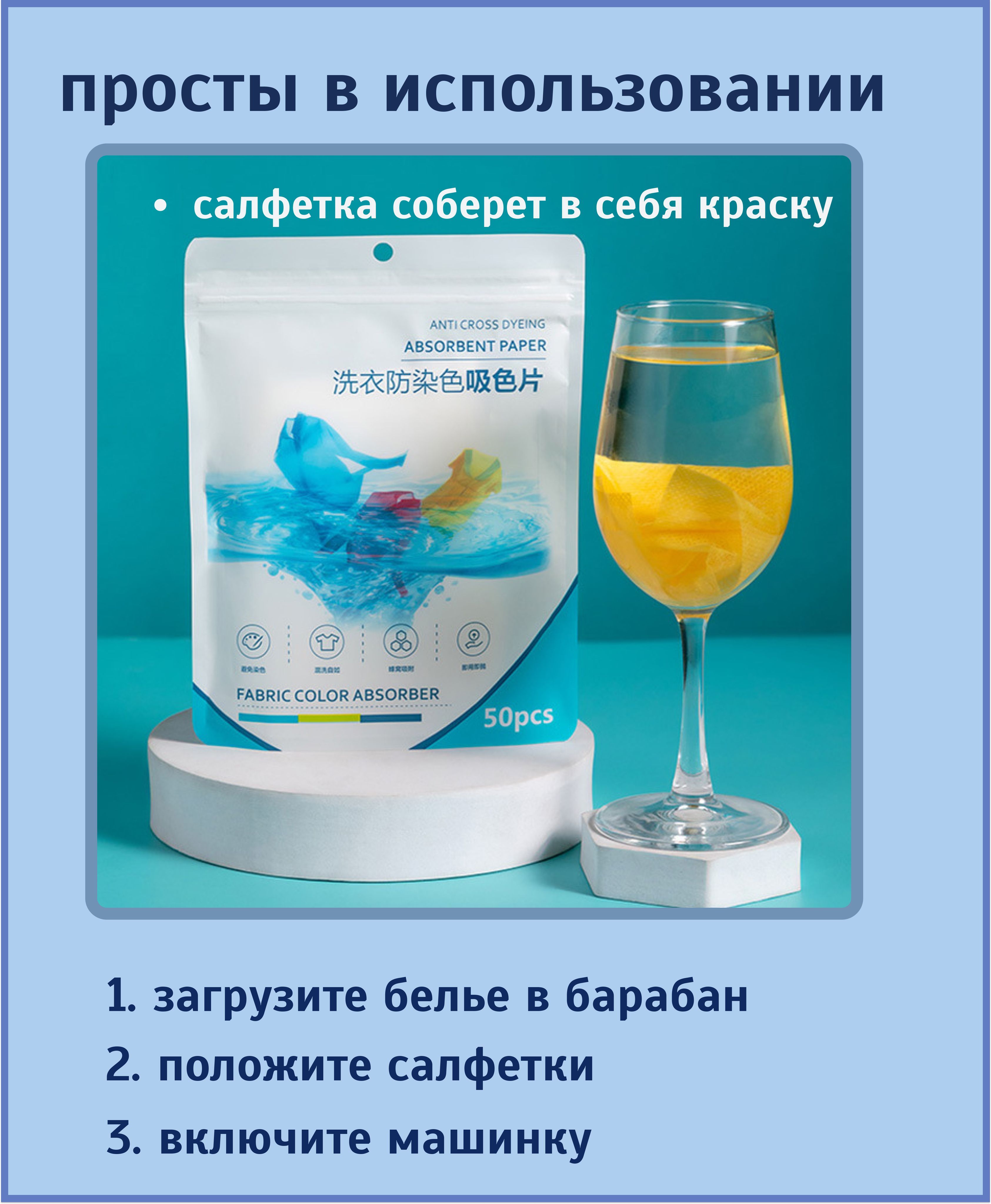 Наш продукт предназначен для стирки как вручную, так и в стиральной машине. Но главное, наши салфетки предотвращают окрашивание других вещей в вашей одежде и дорогих товарах, улавливая краску. Теперь вы можете не беспокоиться о том, что ваша синяя одежда окрасит белую или кремовую.