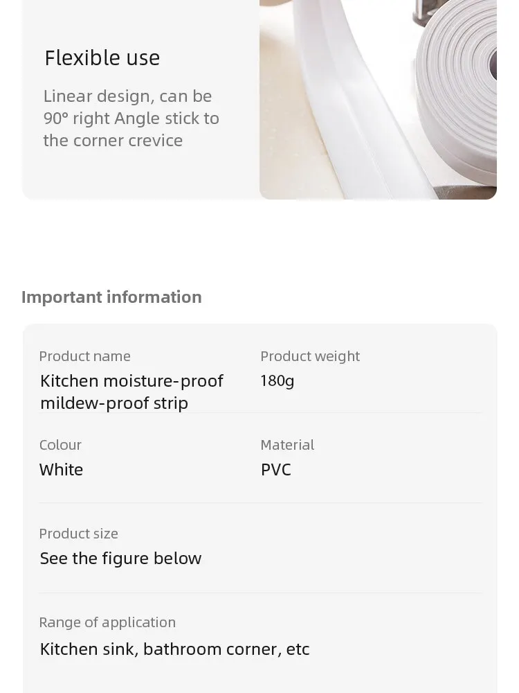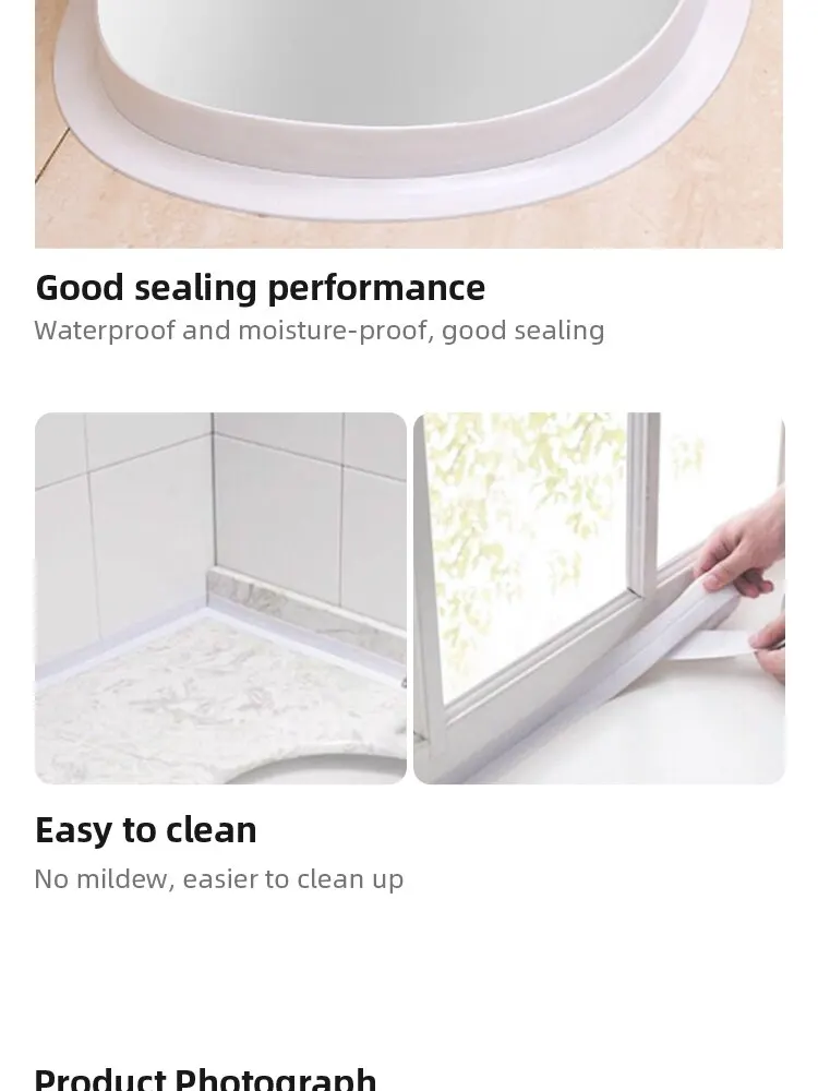 【Широкое применение】: Профессиональные самоклеящиеся водонепроницаемые полоски для уплотнения можно наносить на ванны, ванные комнаты, кухни, раковины, стены, углы, газовые плиты, туалеты или любая гладкая поверхность, которая легко намокнет и загрязнится. Белый подходит для любого фона.