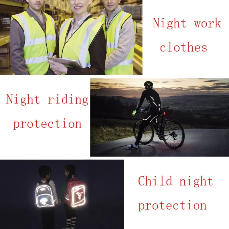 Характеристики: хорошая пластичность, относительно плоская, может быть сшита, высокий коэффициент отражения, яркий и привлекательный цвет, устойчивость к длительным погодным условиям и срок службы. Он изготовлен из светоотражающих материалов с яркими молекулами, которые можно стирать повторно, царапать, старение и устойчивость к истиранию;