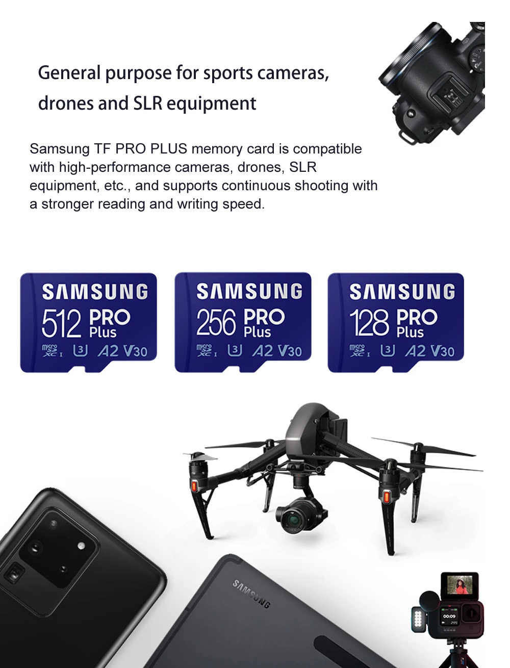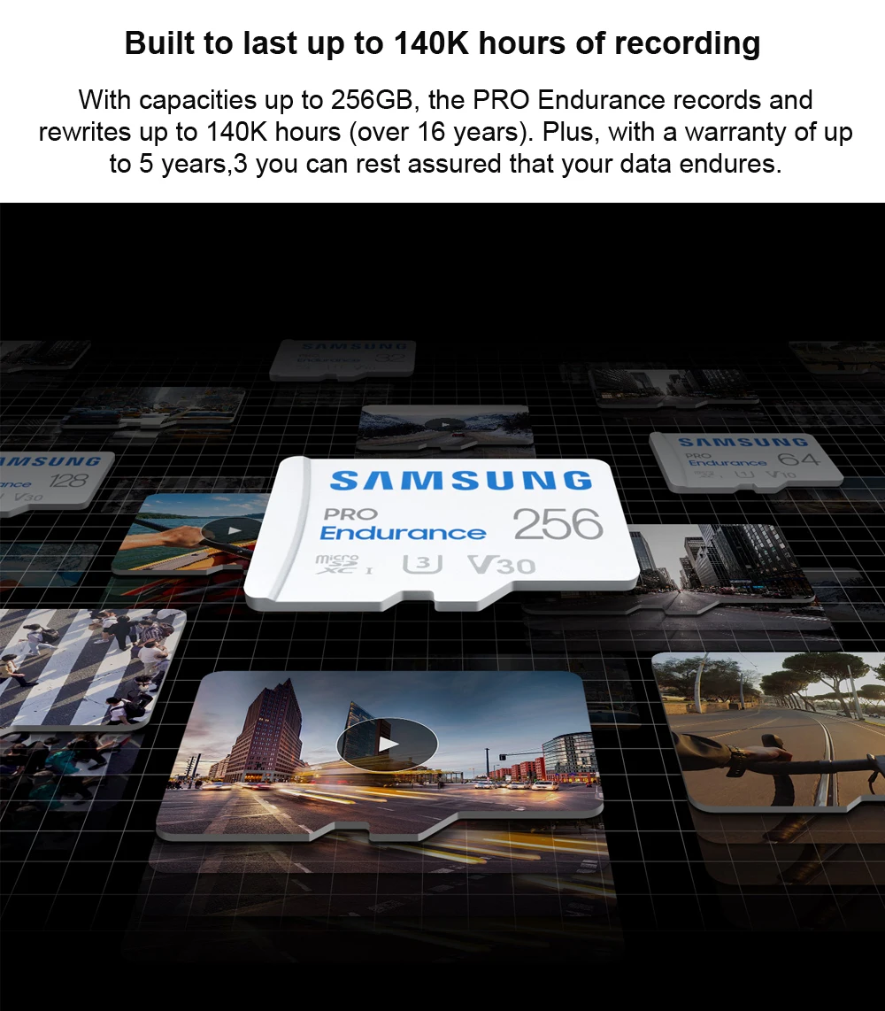 Назначенная на автомобильные видеомагнитофоны, камеры видеонаблюдения и системы наблюдения, карта SAMSUNG с высокой выносливостью microSDXC/SDHC построена с использованием высококачественных флэш-чипов, обеспечивающих долговечность и длительную выносливость. Чтобы обеспечить максимальный уровень надежности, высокопрочная карта microSDXC/SDHC проходит обширные испытания в суровых условиях для проверки водонепроницаемости, термостойкости, статической стойкости, защиты от рентгеновских лучей и ударопрочности.