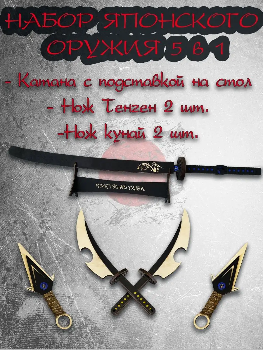 Артикул 143954993 Количество предметов в упаковке Меч катана 1 шт ножны 1шт Нож Тенген 2 шт нож Кунай 2 шт Подставка под катану 1 шт