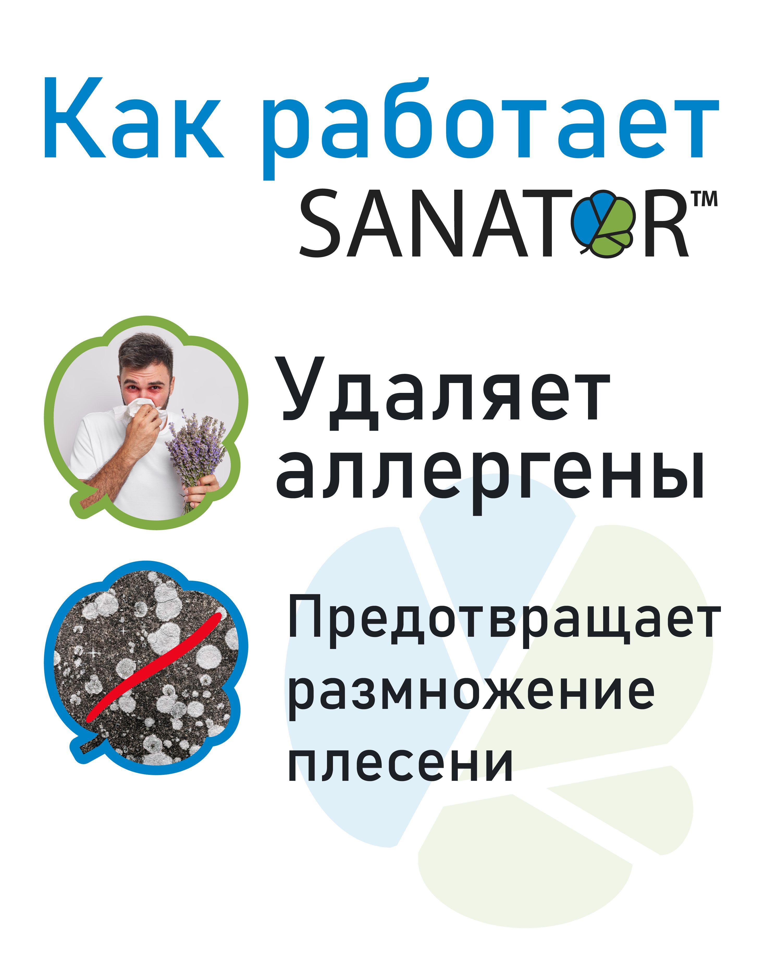 SANATOR-N структурирует воду, способствуя поддержанию длительного эффекта свежести и чистоты в воздухе, не образуя плесень в воде и на поверхностях.