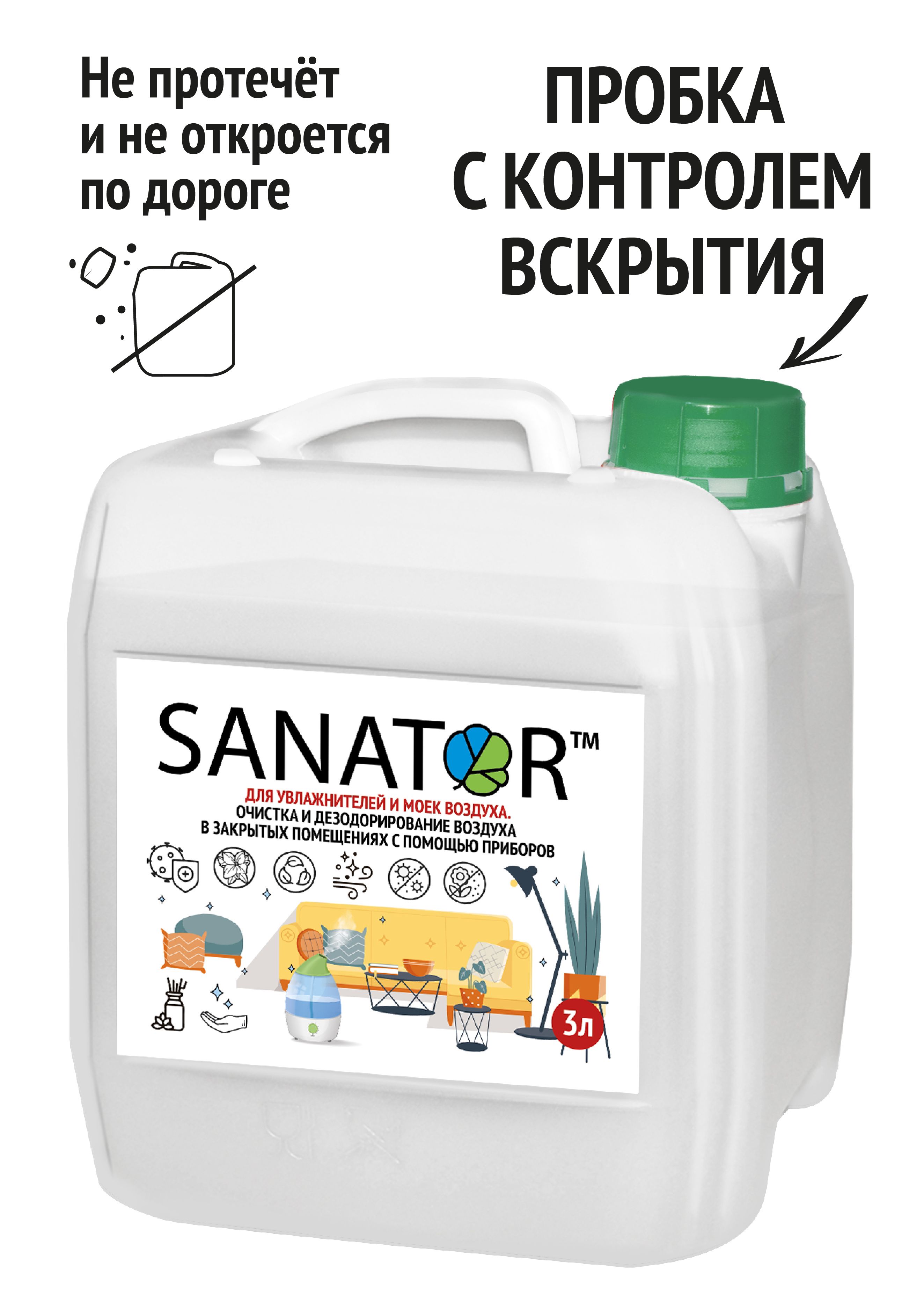 SANATOR-N – биоразлагаемая гигиеническая добавка в увлажнители, мойки воздуха, и триггер-распылители для обработки пространства от микробов и вирусов, освежения пространства, нейтрализации неприятных запахов.