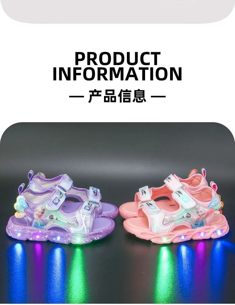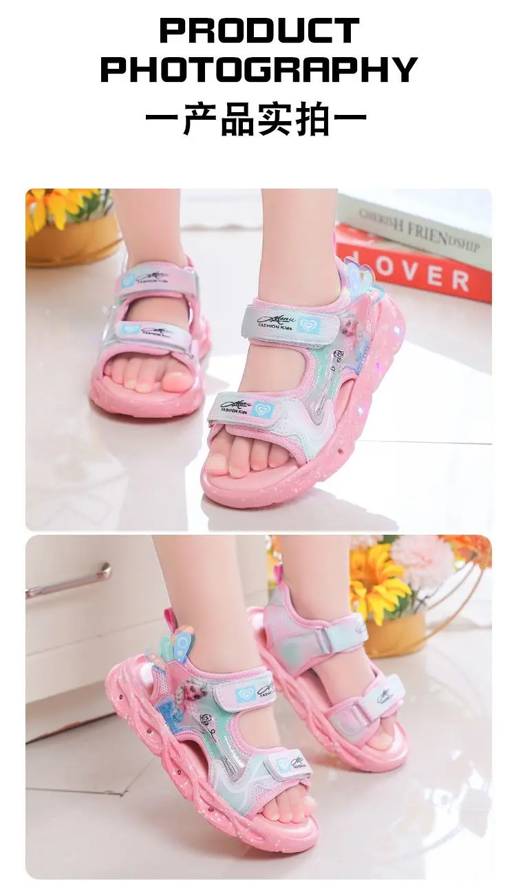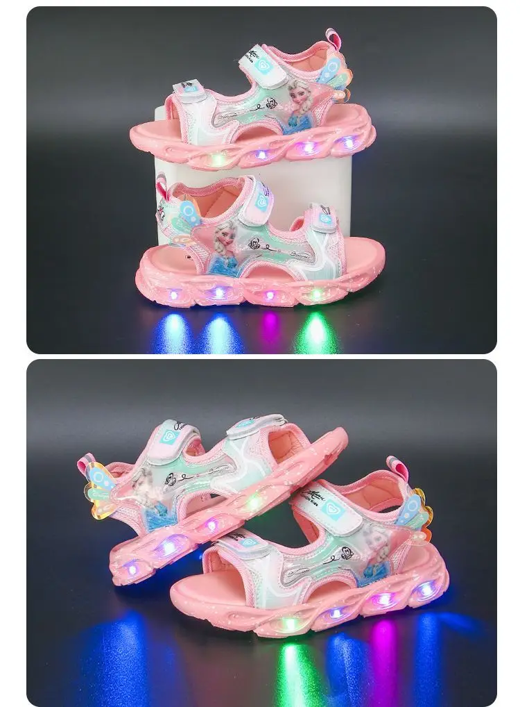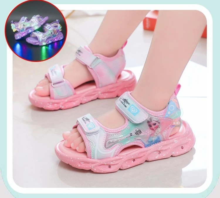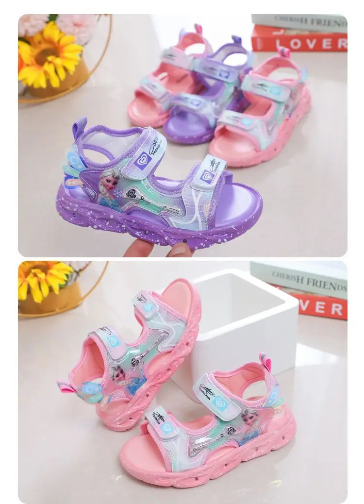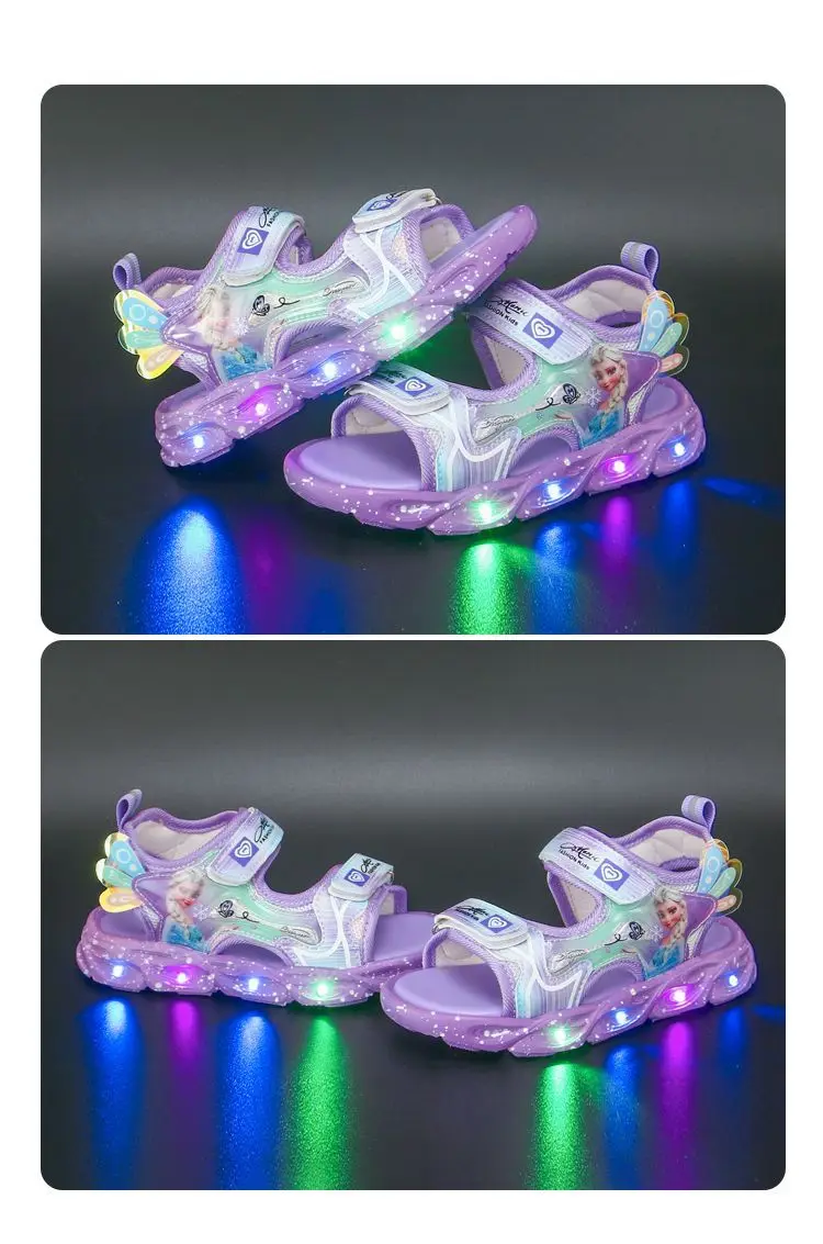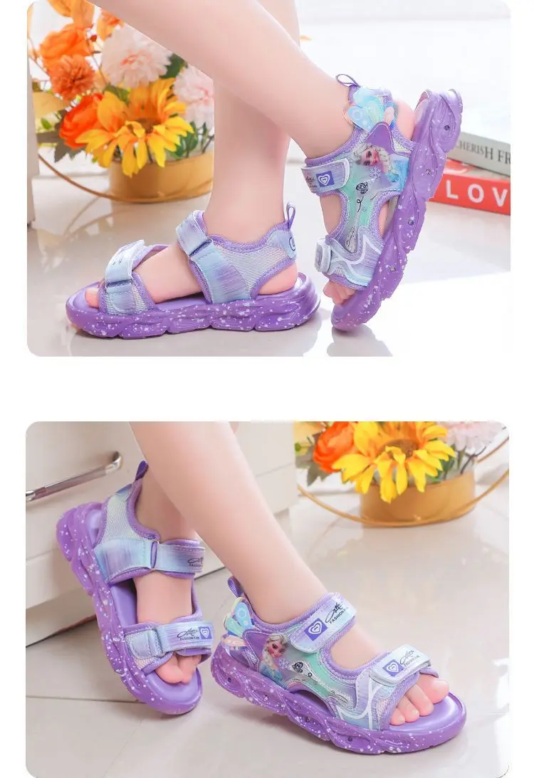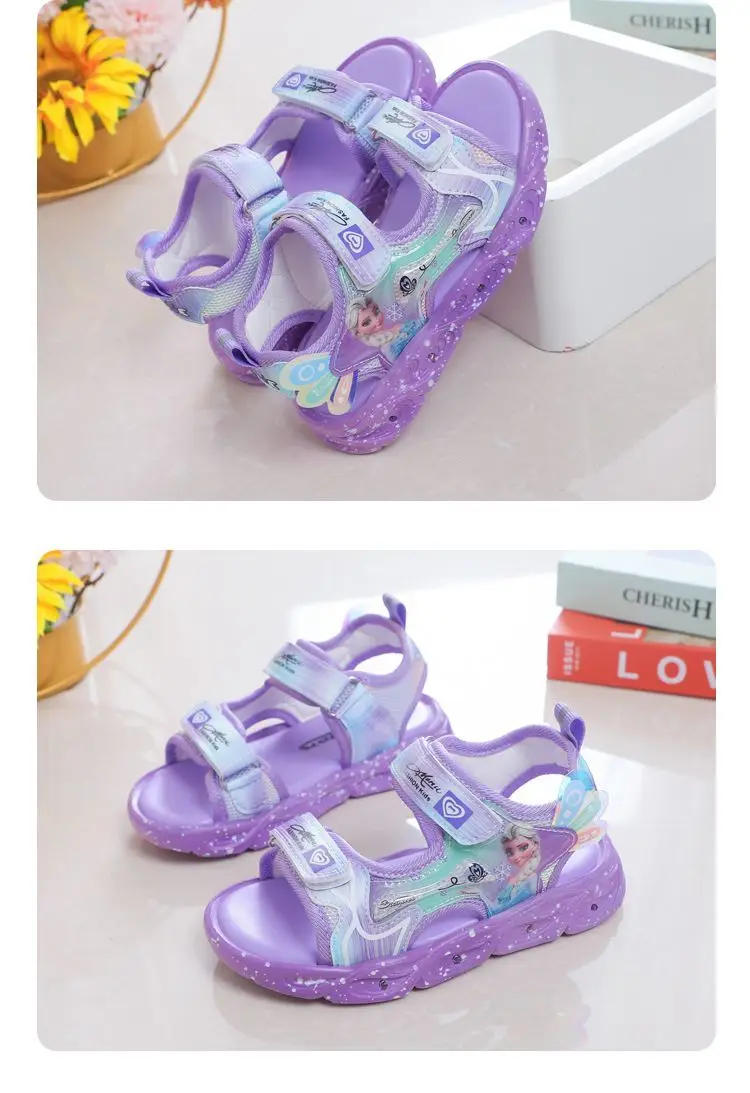 Сандалии Disney для девочек, детские Нескользящие Босоножки с открытым носком, летняя пляжная обувь принцессы, розовые фиолетовые, со светодиодной подсветкой, с мягкой подошвой