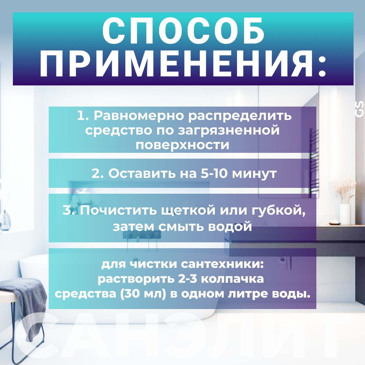 Описание: Средство для эффективного удаления органических загрязнений с поверхности акриловой и эмалированной ванны и душевой кабины. Подходит для поверхностей изготовленных из следующим материалов: акрил, кислотостойкая эмаль, хром, медь, латунь, пластик, нержавейка, керамика. Справляется со следующими загрязнениями: ржавчина, известковые отложения и налет, жир, мыло, следы от капель воды, органические загрязнения. При использовании необходимо одевать резиновые перчатки, чтобы избежать повреждений кожи рук. Имеет следующие достоинства: очень быстро удаляет все виды загрязнений; осуществляет дезинфекцию; средство без абразивных составляющих; не царапает очищаемую поверхность; не содержит хлор; имеет легкий приятный запах. Применение: нанести средство на загрязненную предварительно смоченную поверхность, оставить на некоторое время (10-15 минут), в зависимости от глубины загрязнения (5-15 минут), при необходимости использовать щетку, смыть проточной водой. Сильно загрязненные участки обработать повторно.
