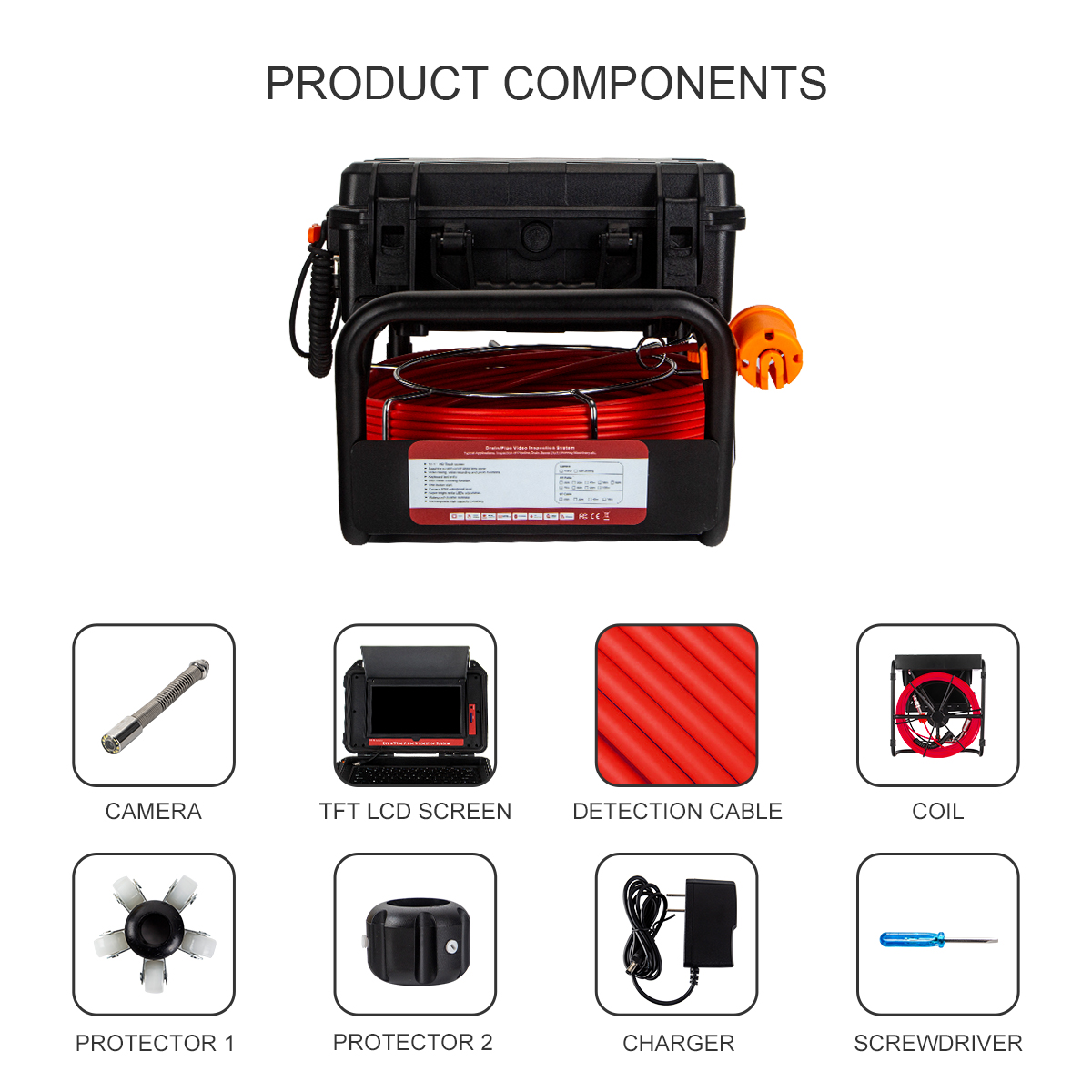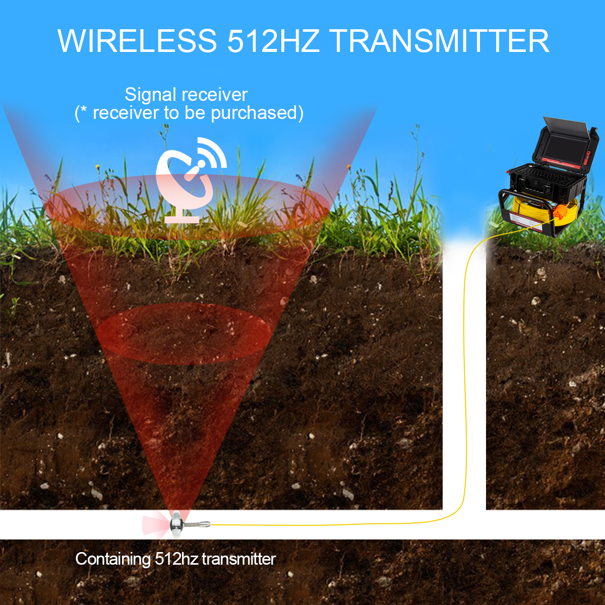 В эту эндоскопическую камеру встроен передатчик 512 Гц, который может легко обнаружить любую блокировку или интересующую область. Это значительно помогает сэкономить время от необходимости копать и находить проблему. Зонд передает сигнал частотой 512 Гц, который можно принять с помощью любого совместимого локатора, что позволяет точно определить положение передатчика под землей (локатор-приемник НЕ входит в комплект).