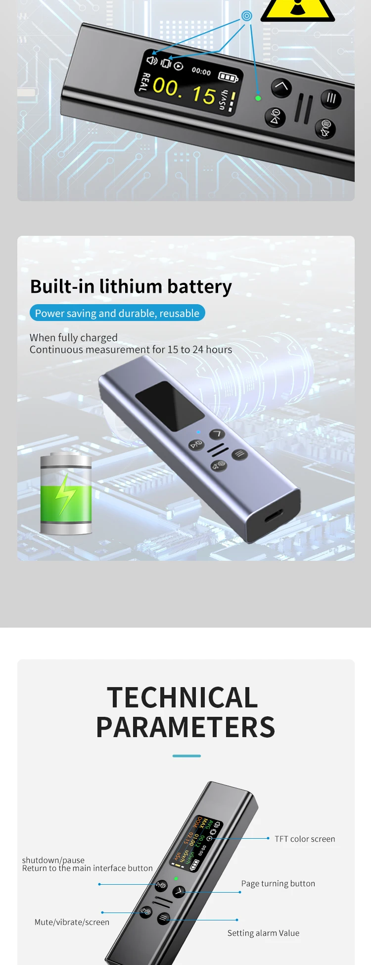 НИЗКАЯ ЭНЕРГИЯ CONSUMPTION-TFT ДИСПЛЕЙ-Цифровой счетчик Гейгера был выбран с мощным микропроцессором с TFT-дисплеем для четких данных измерения страниц и упрощения работы. Благодаря встроенной перезаряжаемой литиевой батарее емкостью 400 мА детектор ядерного излучения может непрерывно измерять в течение 15-24 часов после всего 1 часа зарядки.