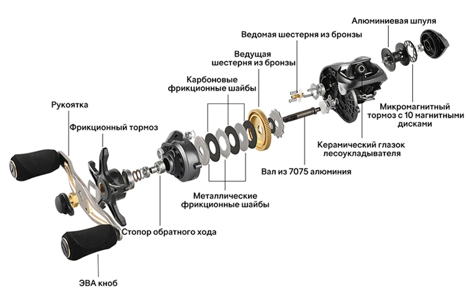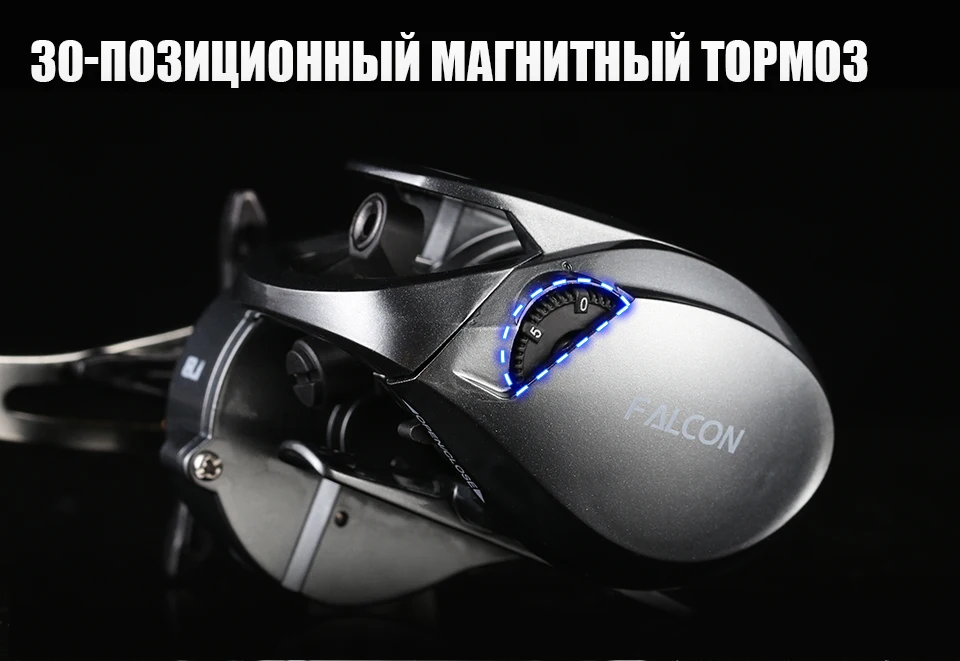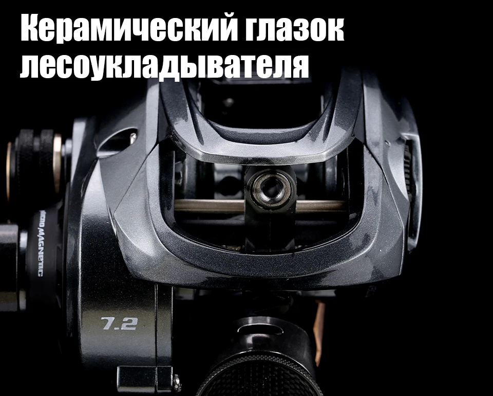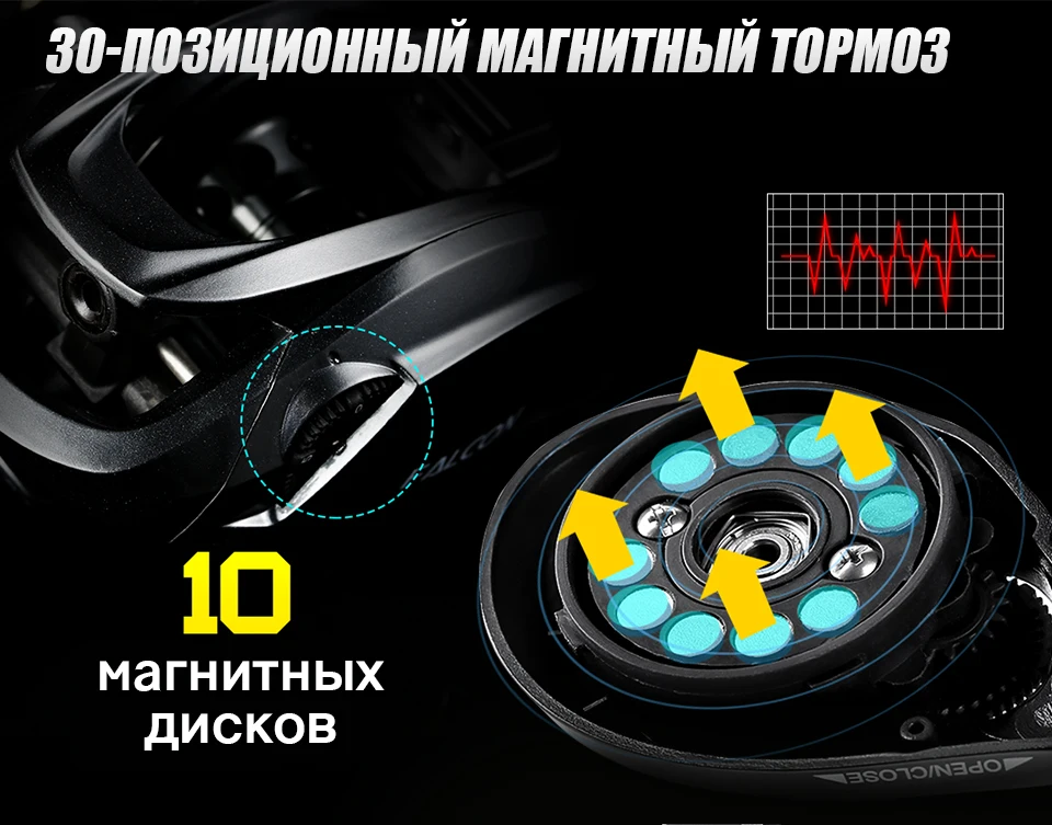 Микромагнитная тормозная система нового поколения для точного управления, 10 магнитных дисков, размещенных для оптимизации магнитного воздействия на алюминиевую шпулю, обеспечивают максимальный контроль заброса.