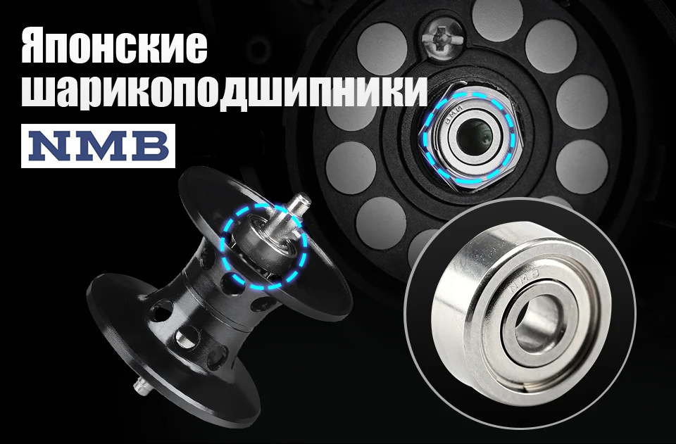Используются 2 японских шарикоподшипника NMB на шпуле и боковой крышке, 4 подшипника из нержавеющей стали на кнобе и 4 экранированных подшипника из нержавеющей стали, обеспечивающих плавный  и дальний заброс, плюс подшипник стопора обратного хода всего 10+ 1 BB.
