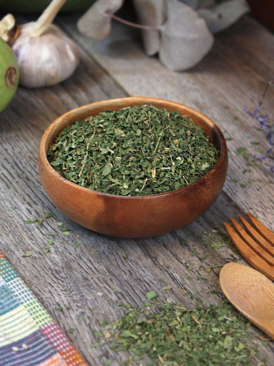Описание: Сушеные листья сельдерея - это вкусная и ароматная добавка в пищу, прекрасная альтернатива свежим листьям сельдерея. Зелень сельдерея имеет горьковато-солоноватый привкус, являясь природным источником натрия. Сельдерей обладает противовоспалительными, антиоксидантными, очищающими свойствами. Такие свойства объясняются наличием в составе сухого сельдерея витаминов группы В, А, Е, К, микро и макроэлементов, эфирных масел и аминокислот. Сельдерей листовой добавляют в мясные, рыбные и грибные блюда, гарниры, супы, используют при мариновании и засолке овощей. Он прекрасно дополнит соусы и заправки для салатов.