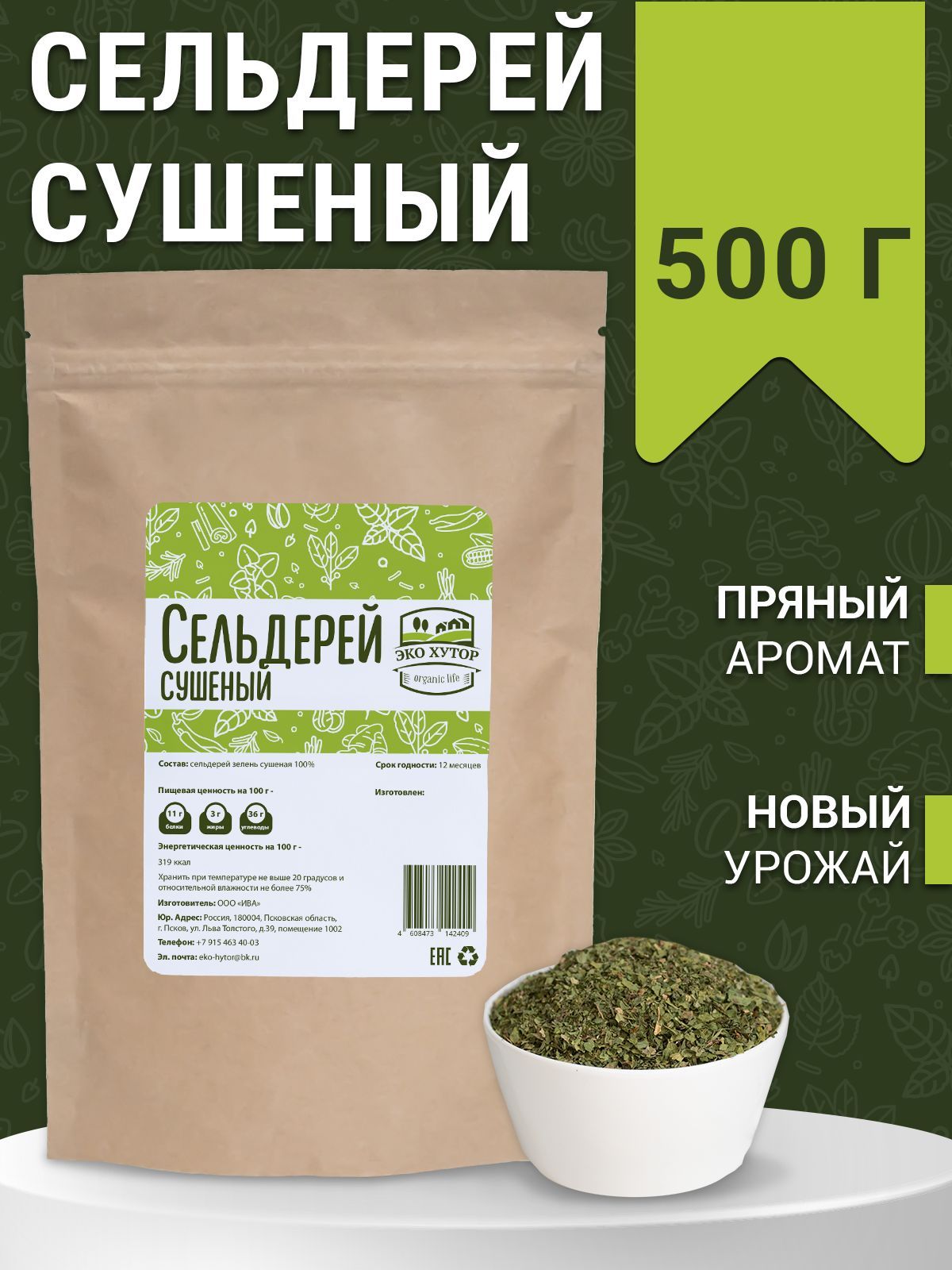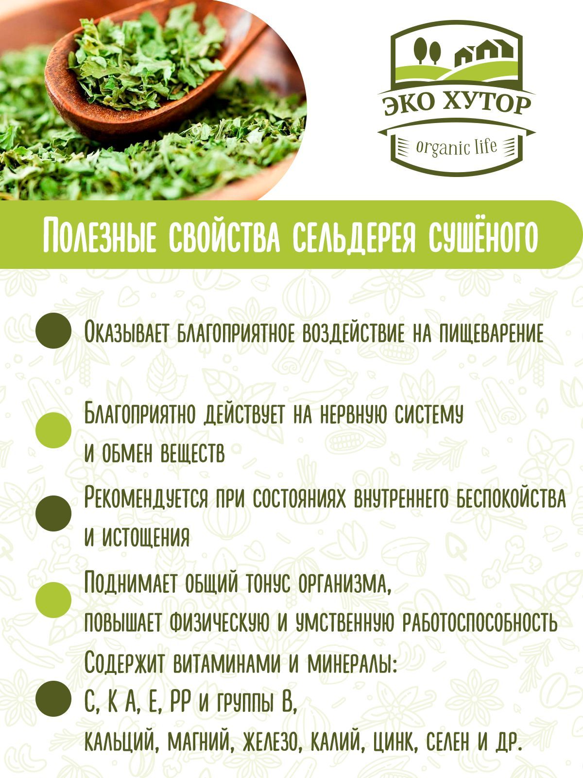 Описание: Сушеный сельдерей — это измельченные листья травянистого растения сельдерей (семейство зонтичных). Сушеный сельдерей используется как ароматная специя для различных блюд. В приправе содержится целый минеральный комплекс: железо, натрий, калий, магний, кальций, фосфор, витамины группы В (в том числе, В6 — фолиевая кислота), а также С, А, К, РР, антиоксиданты. Сушеный сельдерей можно добавлять в пищу при различных диетах. В пищевой промышленности сельдерей применяют как один из компонентов сухих пряных смесей, в соусах, в маринадах и солениях овощей, в консервах. В кулинарии зелень сельдерея добавляют в приправы, мясные или рыбные блюда. Обладает характерным для сельдерея горьковато-солоноватым вкусом. Торговая марка "Egyeurope Herbs"