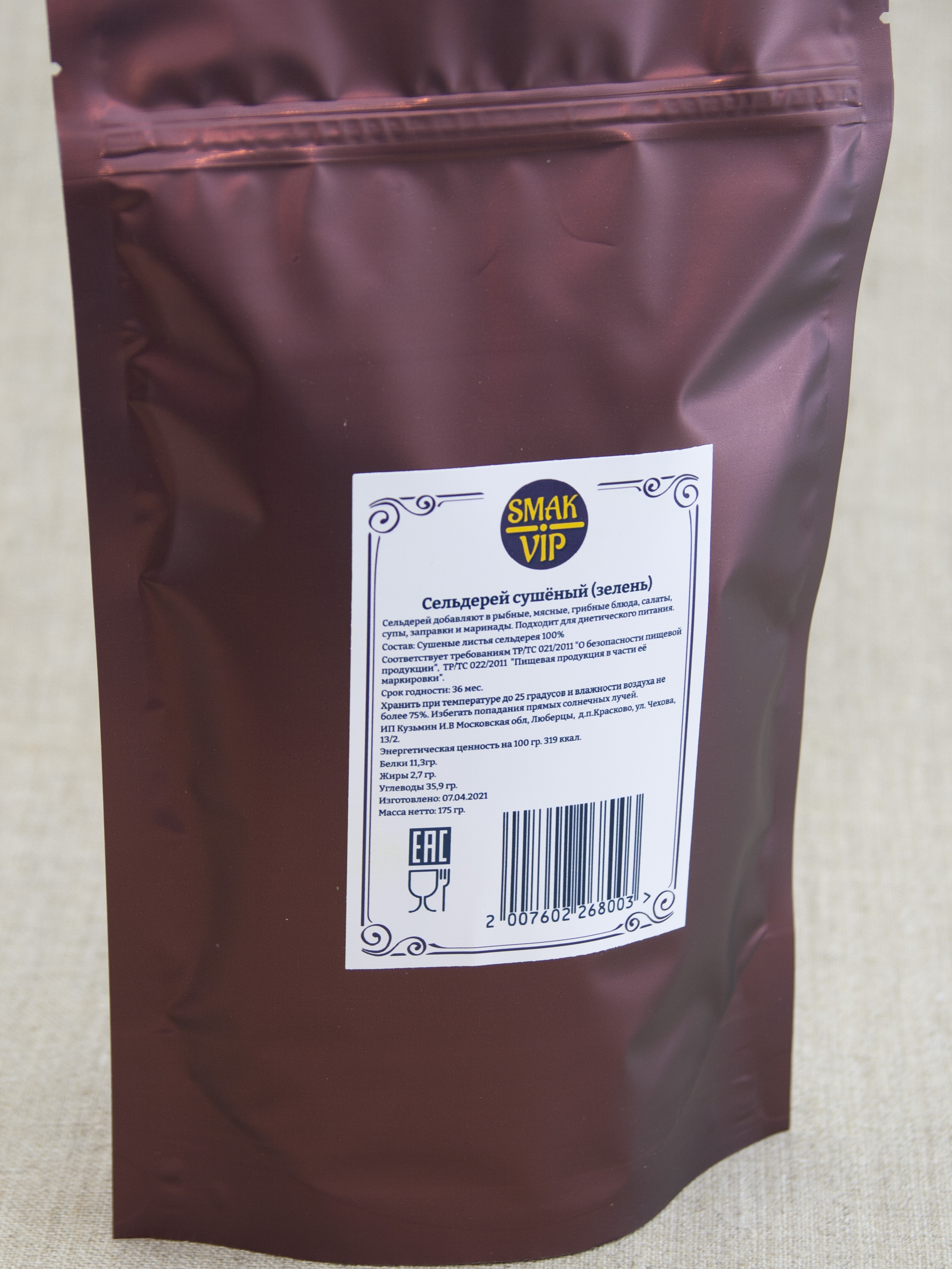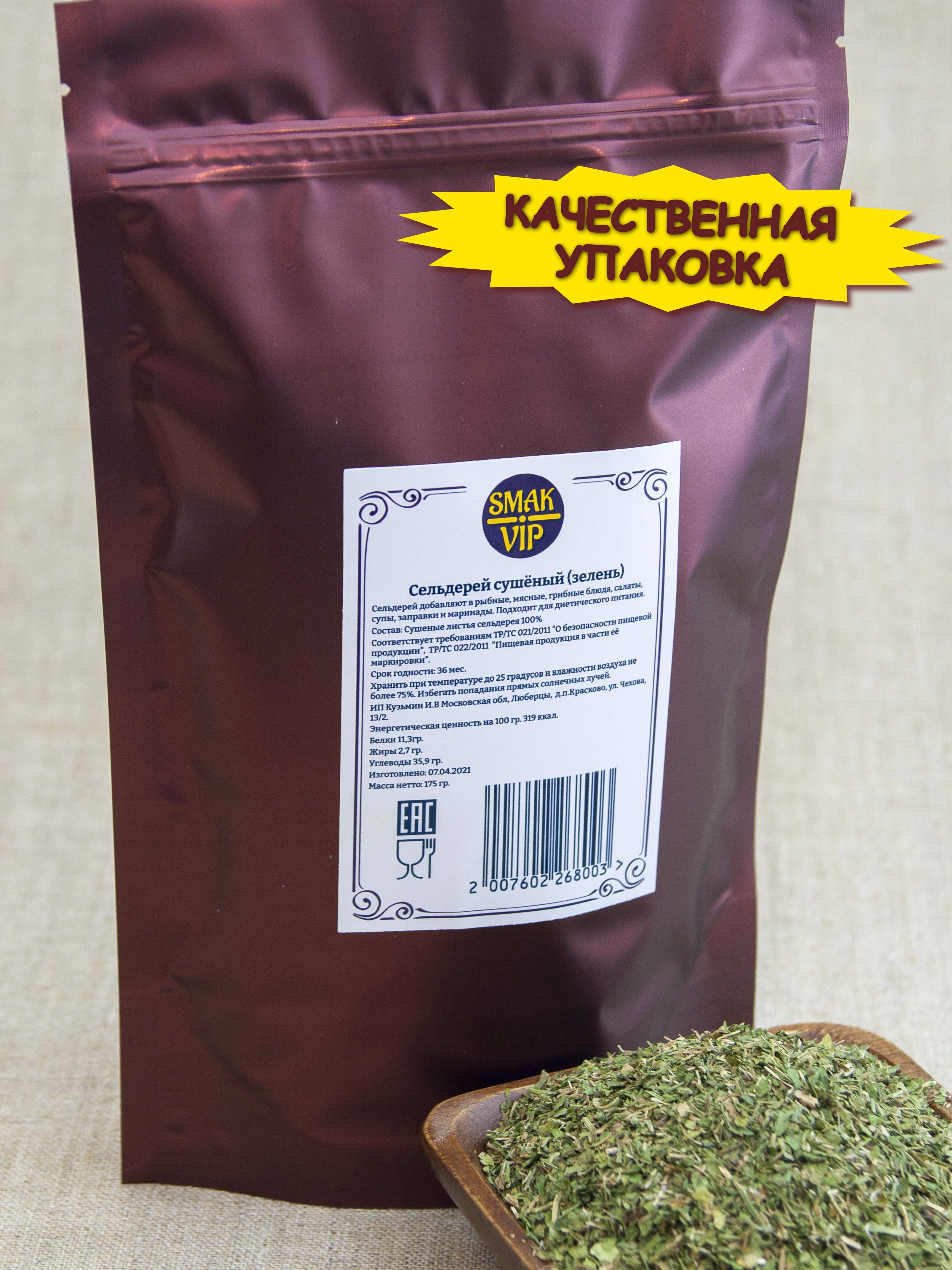 Описание: Сельдерей сушёный листья  - вкусоароматическая добавка в пищу, прекрасная альтернатива свежим листьям сельдерея. Зелень сельдерея имеет горьковато-солоноватый привкус, являясь природным источником натрия. Листья сельдерея обладают противовоспалительными, антиоксидантными,  очищающими свойствами. Такие свойства объясняются наличием в составе сухого сельдерея витаминов группы В, А, Е, К, микро и макроэлементов, эфирных масел и аминокислот. Сельдерей листовой добавляют в мясные, рыбные и грибные блюда, гарниры, супы, используют при мариновании и засолке овощей. Он прекрасно дополнит соусы и заправки для салатов. Не обходите вниманием эту замечательную пряную приправу, которая обогатит полезными свойствами ваши блюда!