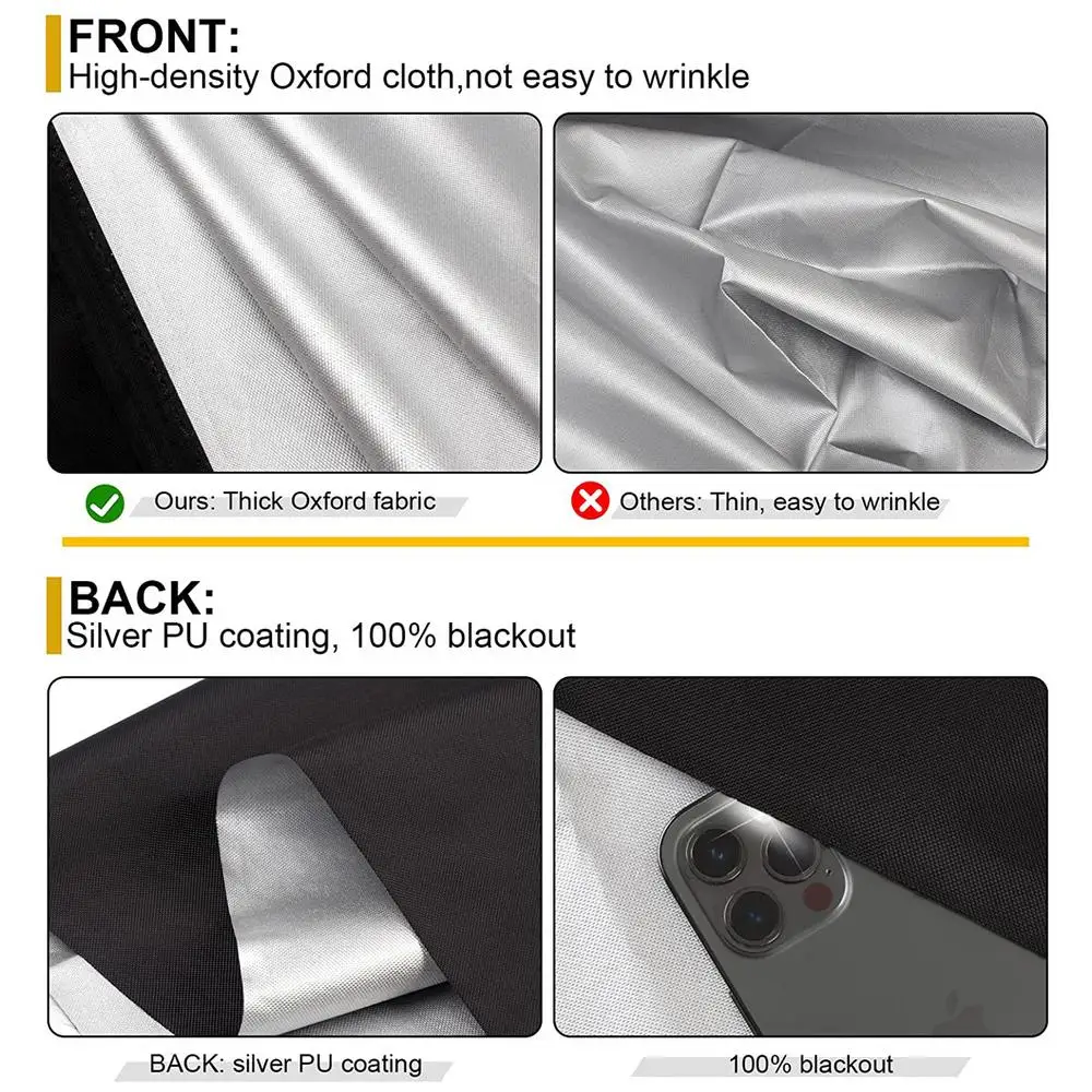 2. Высококачественный Материал: эта ткань для затемнения окон изготовлена из ткани Оксфорд высокой плотности, которая может на 100% блокировать солнечный свет и ультрафиолетовые лучи, А другая сторона оснащена высококачественным серебряным полиуретановым покрытием для уменьшения попадания тепла в комнату.