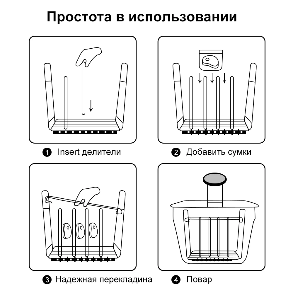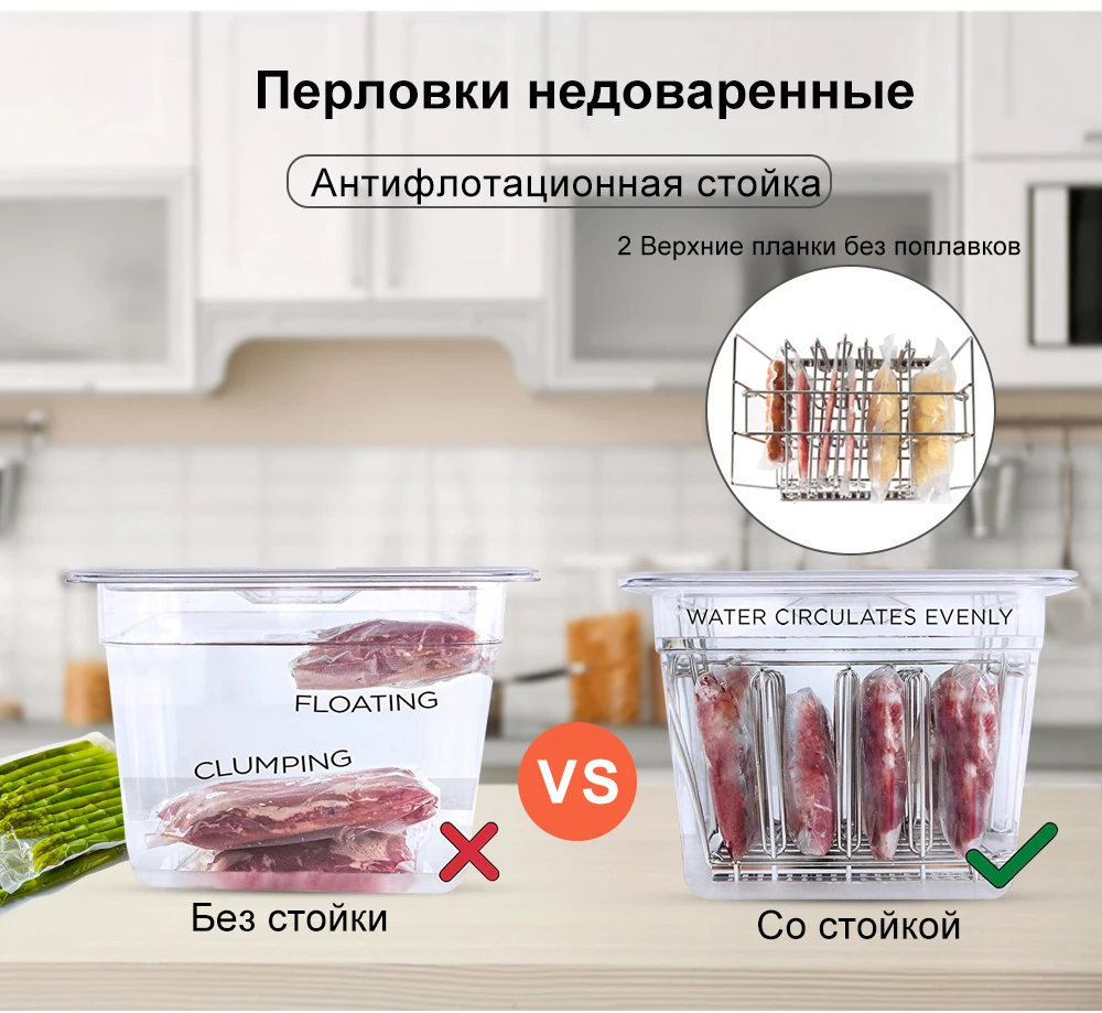 • Более равномерно готовьте: разложите свои мешочки по стойке, чтобы готовить больше еды в вашем контейнере 11 литров с полной циркуляцией воды вокруг каждого мешка.
