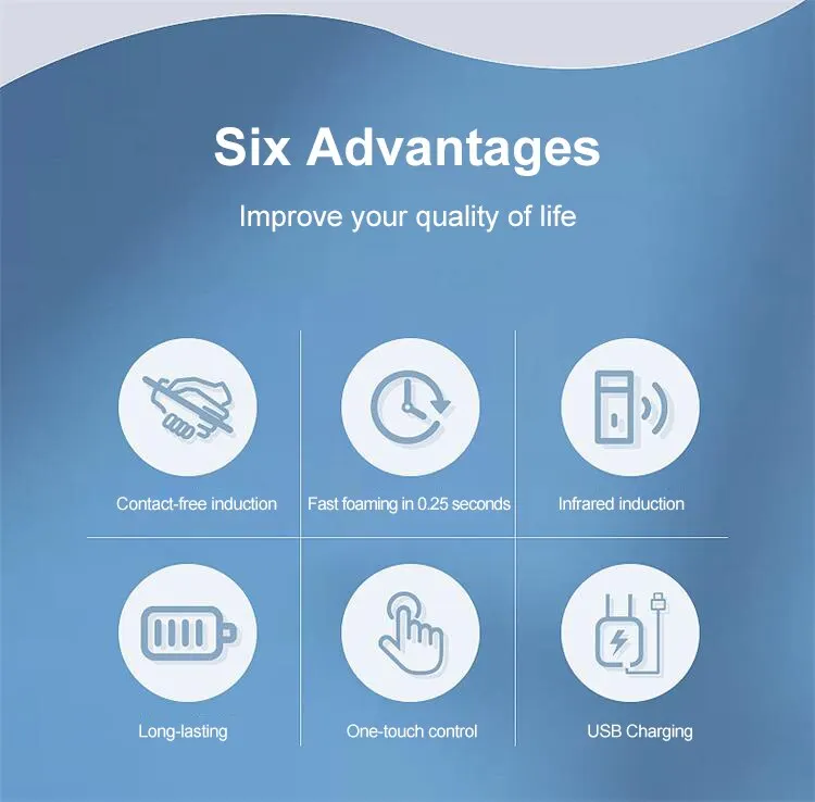 • Автоматические дозаторы пенного мыла:Дозатор автоматически создает пену, облегчая очистку и уменьшая необходимое количество мыла.