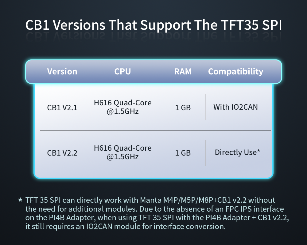 Из-за отсутствия интерфейса FPC IPS на адаптере PI4B при использовании TFT 35 SPI с адаптером PI4B + CB1 v2.2 требуется модуль IO2CAN для преобразования интерфейса.