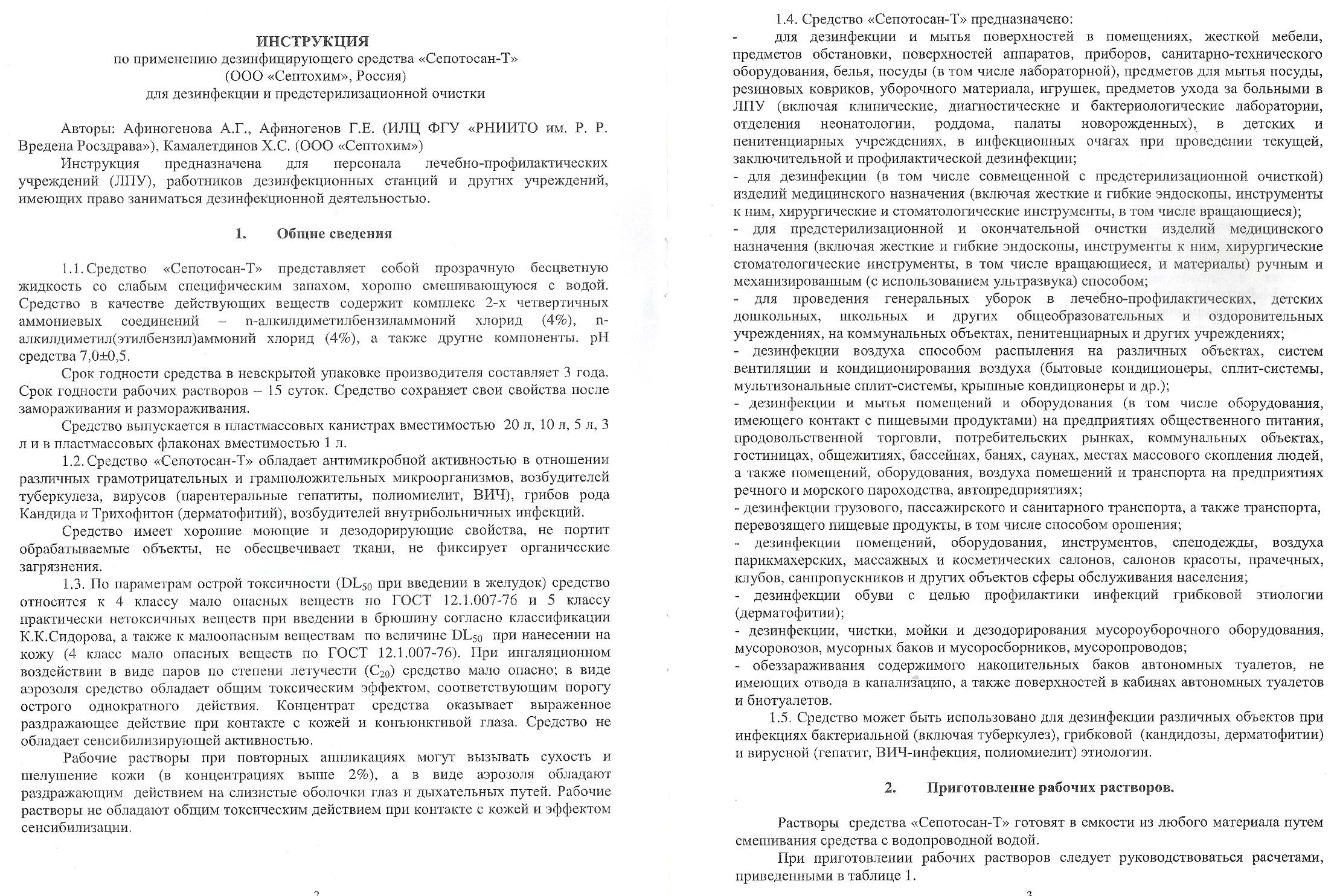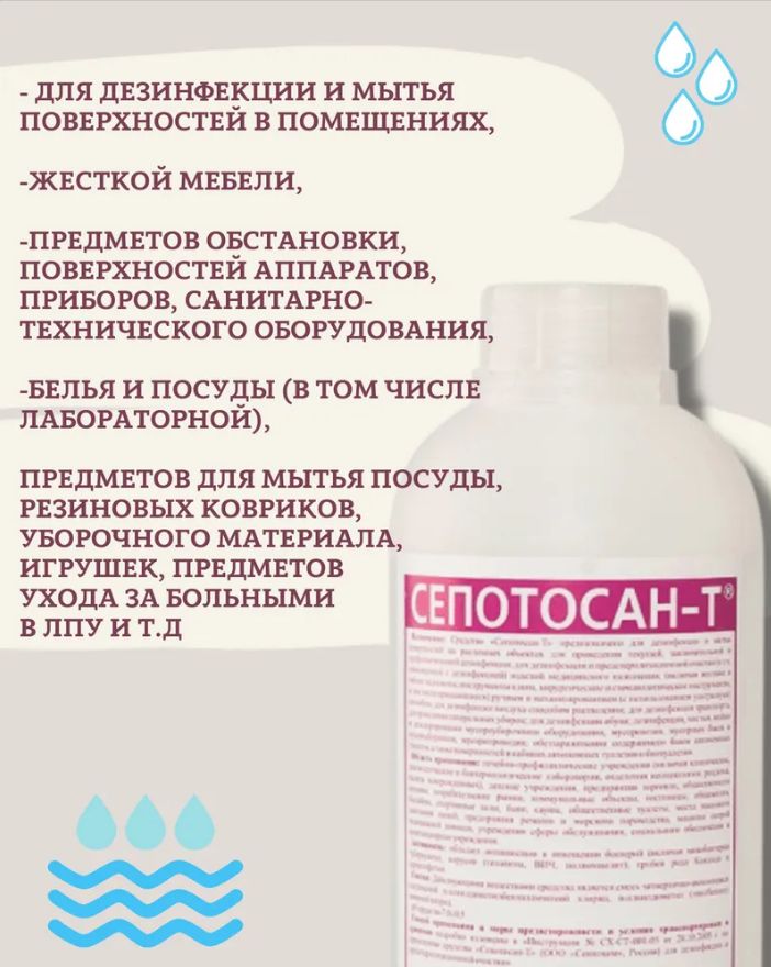 Описание: Средство Сепотосан-Т имеет хорошие моющие и дезодорирующие свойства, не портит обрабатываемые объекты, не обесцвечивает ткани, не фиксирует органические загрязнения. Назначение и сфера применения средства Сепотосан: