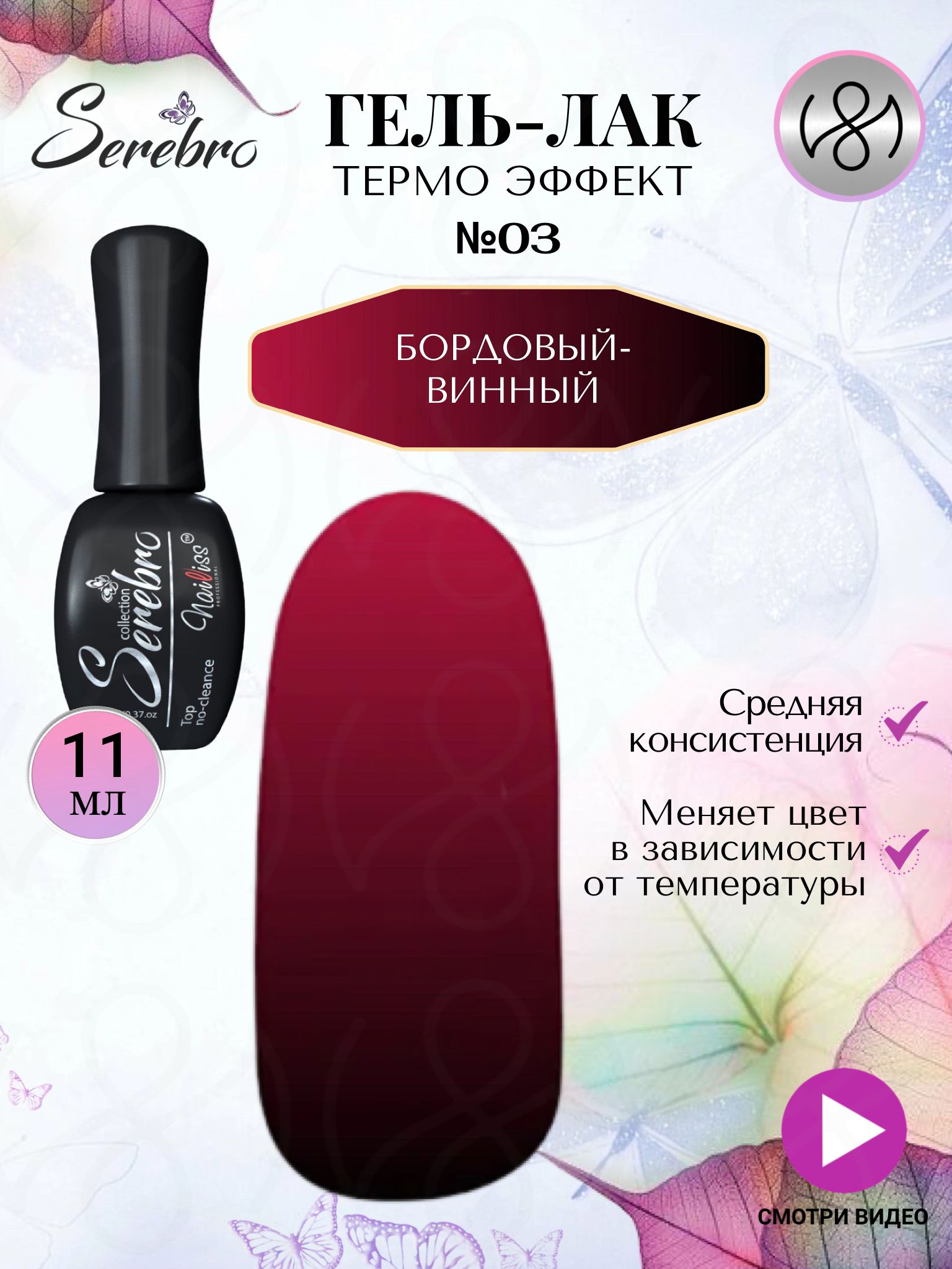 Описание: Гель лак Термо эффект "Serebro collection" №03, 11 мл. Гель лак (бордовый-винный). Средней консистенции. Плотной пигментации. Рекомендуется наносить в 1-2 слоя. Термолак – это декоративное лаковое покрытие для ногтей, меняющее цвет в зависимости от температуры тела и окружающей среды. Изменение цвета пигмента достигается за счет присутствия в составе термочувствительных частиц. Под воздействием температур на ногтевых пластинах появляется градиент с плавным переходом. Наибольшая смена цвета наблюдается на свободном крае, так как температура там всегда ниже – кончик ногтя не соприкасается с кожей. Внимание: цвет гель-лака Serebro может немного отличаться от оригинала, так как на это влияет цветопередача и калибровка монитора. ООО ЭФДИСИ является официальным дистрибьютором бренда "Serebro" и следующих товаров: База для гель лака, гель лак для ногтей, топ для ногтей , пилки для ногтей, стразы для ногтей, наклейки для ногтей, блестки, гелевые типсы, втирка для ногтей, пушер маникюрный, баф для ногтей, сменные файлы для пилки, полигель для наращивания ногтей, масло для кутикулы, набор для маникюра, лак для ногтей, акригель для наращивания ногтей.