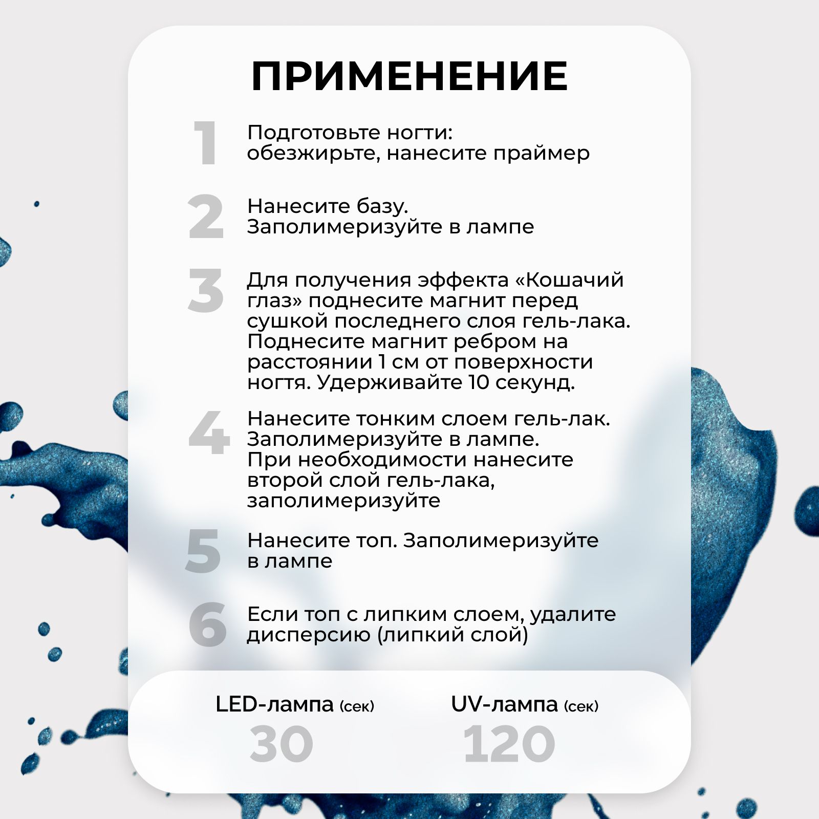 Описание: Уход за руками и ногами - важная часть ухода за собой любой девушки! В этом вам поможет компания Serebro, имеющая большой ассортимент товаров для маникюра и педикюра. Самовыравнивающийся плотный магнитный гель лак с перламутром "Кошачий глаз LUX" №07 голубого цвета, 11 мл. Блестящий (мерцающий) гель-лак с эффектом кошачий глаз и переливами цвета - это уже готовый дизайн для маникюра. Цветной гель-лак комфортен в работе, имеет приятный аромат и не тускнеет в процессе носки. Декоративное покрытие средней консистенции помогает избежать затеков, способствует равномерному покрытию ногтевой пластины без лишней толщины и обладает сроком носки от 2 до 4 недель. Также имеет плотный пигмент и дает насыщенный оттенок при нанесении в 1-2 тонких слоя. Гипоаллергенный гель лак для маникюра и педикюра не содержит агрессивных компонентов и не портит натуральный ноготь. Благодаря удобной кисточке даже начинающий мастер сможет легко нанести цветной шеллак на ногтевую пластину. После нанесения маникюр приобретает дополнительную защиту от сколов, трещин и отслоек. Профессиональные материалы Serebro (Серебро) подходят для салона красоты и для работы на дому. Подберите все для маникюра и педикюра себе или в подарок любимой жене, девушке, дочке, сестре или коллеге.