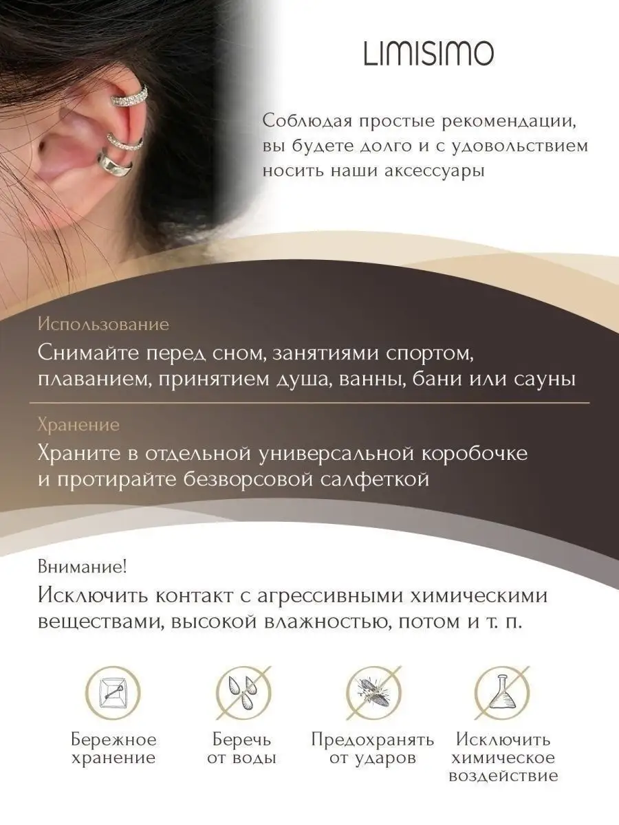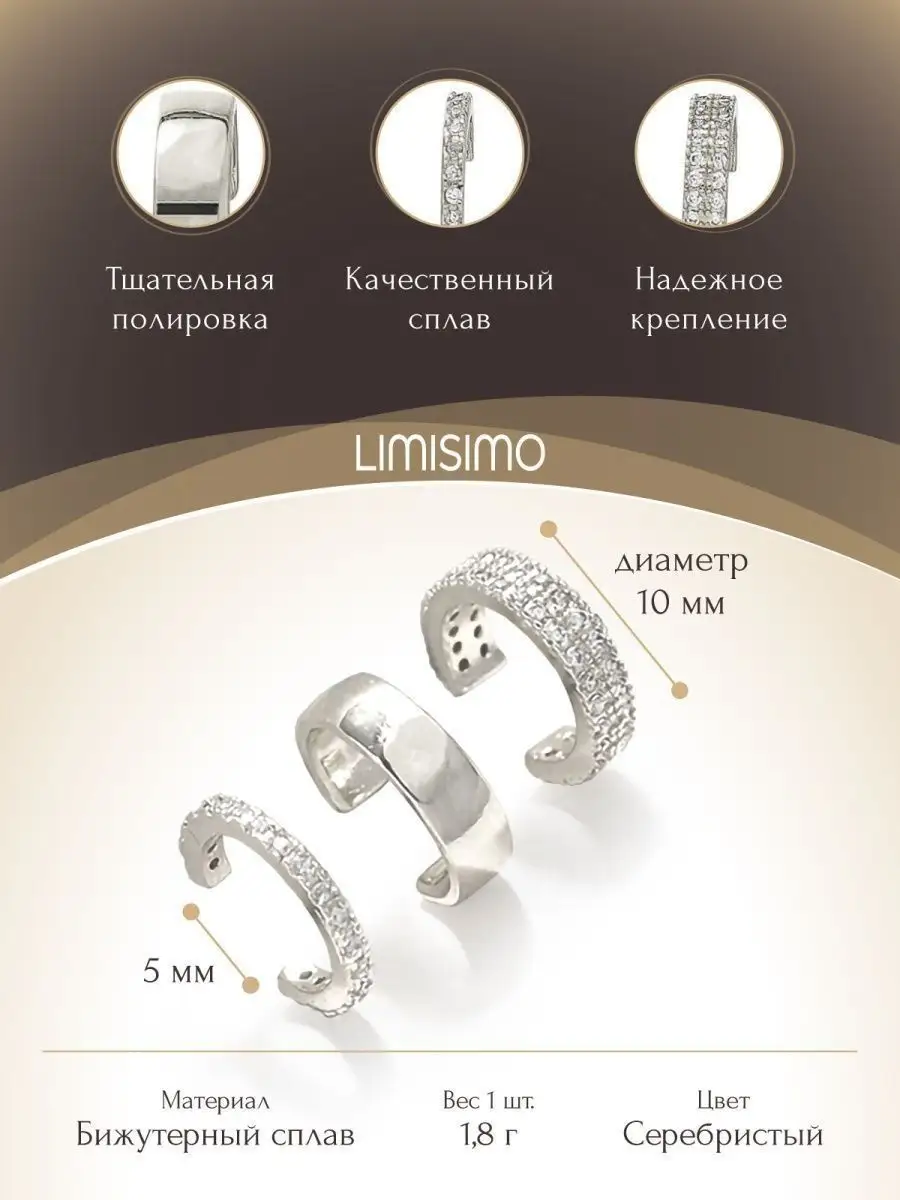 Описание: Привет! Позволь мне представить тебе невероятный набор кафф - идеальный выбор для стильных девушек и молодых модниц. Серьги бижутерия каффы представлены в наборе 3 шт. Каффы имеют размеры 13 на 5 мм и вес 1,4 г. Если ты ищешь стильные серьги, которые добавят тебе изюминку и подчеркнут вашу уникальность, то сережки-каффы именно то, что тебе нужно. Эти нежные каффы без прокола безопасные для кожи и прочные. Серьги бижутерные из набора можно носить как обычные сережки, так и использовать в качестве клипс на уши. Серьги каффы также идеально подходят для тех, кто не хочет делать настоящий прокол хряща. Сережки женские подойдут как для подростков, так и для взрослых женщин. Они добавят свежести и индивидуальности твоему образу, подчеркнув твой стиль и неподвластность стереотипам. Каффы серебро выполнены в винтажном и нежном дизайне, который так популярен в линии бижутерии корейских брендов. Это не только аксессуары, но и настоящие произведения искусства, которые ты сможешь носить и демонстрировать с гордостью. Набор сережек - это точно то, чего тебе не хватает в твоей коллекции украшений. Не упусти шанс сделать свой образ неповторимым и запоминающимся с этим удивительным набором женских сережек.