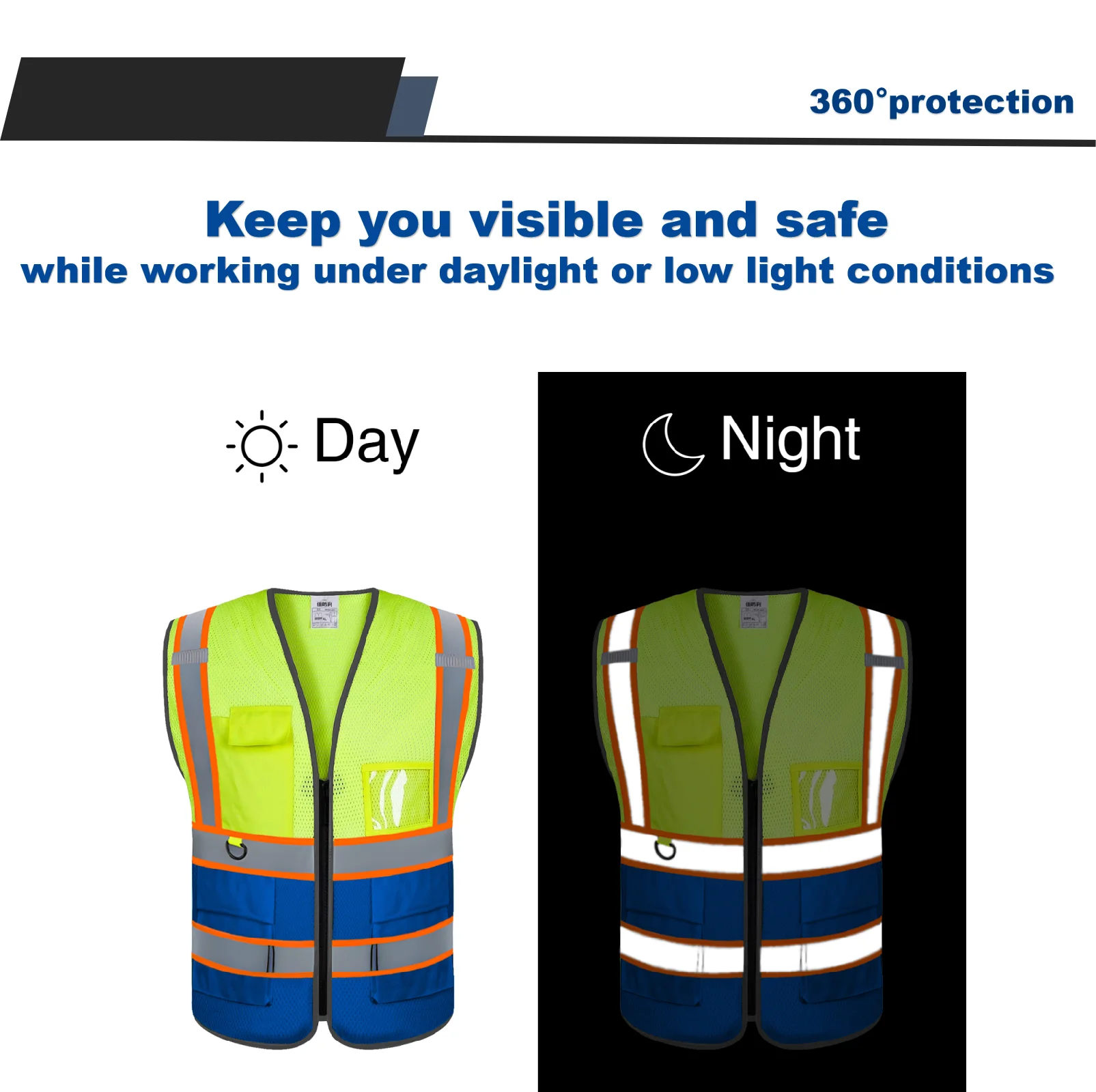 Жилет безопасности Индивидуальный логотип Высокая видимость Молния Передний защитный жилет со светоотражающими полосами Соответствует стандарту ANSI/ISEA Class 2 Type R Standard