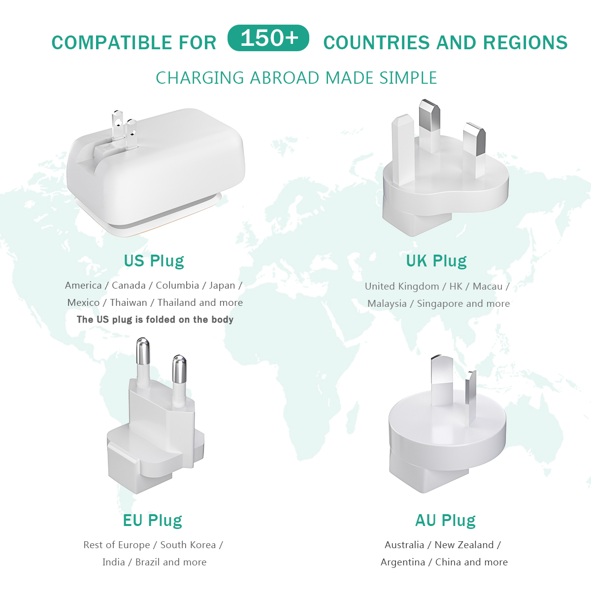 Портативный адаптер с разъемом USB со сменными разъемами стандарта Великобритании/США/ЕС/Австралии и международной совместимостью с напряжением позволяет легко заряжать несколько устройств, куда бы вы ни отправились. Идеально подходит для розеток типа A/ B/ C/ E/ F/ G/ H/ J/ K/ L/ N по всему миру.