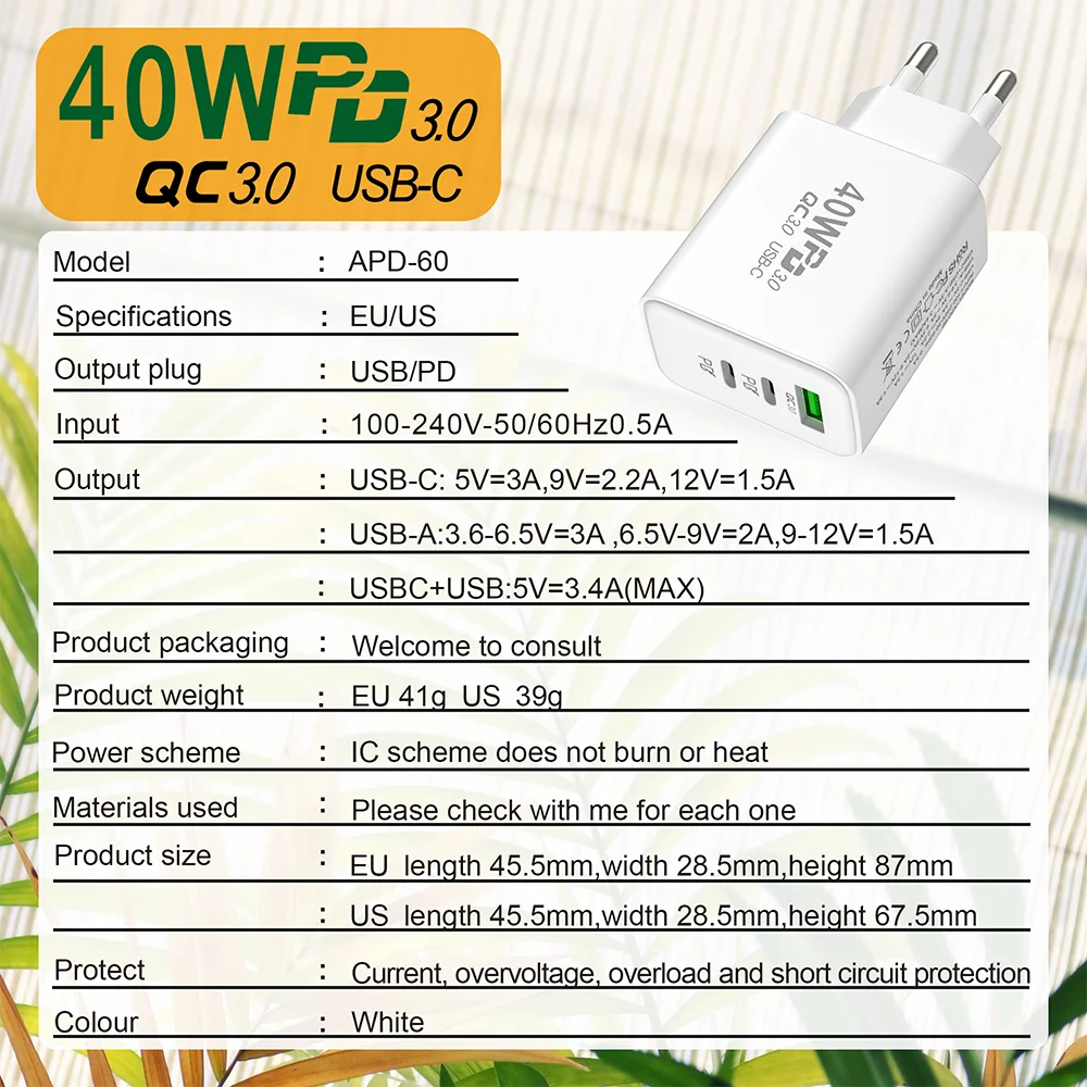 60 Вт USB-зарядное устройство типа C PD 40 Вт адаптер для быстрой зарядки мобильного телефона для iPhone Samsung Xiaomi Huawei Quick Charge 3,0 настенное зарядное устройство