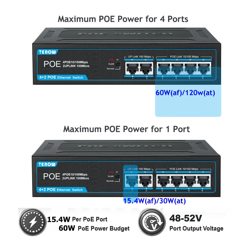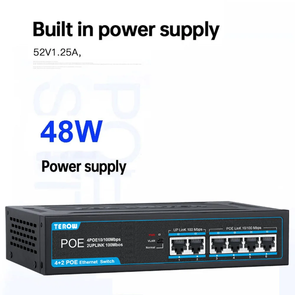 POE Switch 4 Ports +2 Uplink Fast Ethernet Switch 100Mbps Network Switch RJ45 Injector Switcher for IP Camera/Wireless AP/CCTV