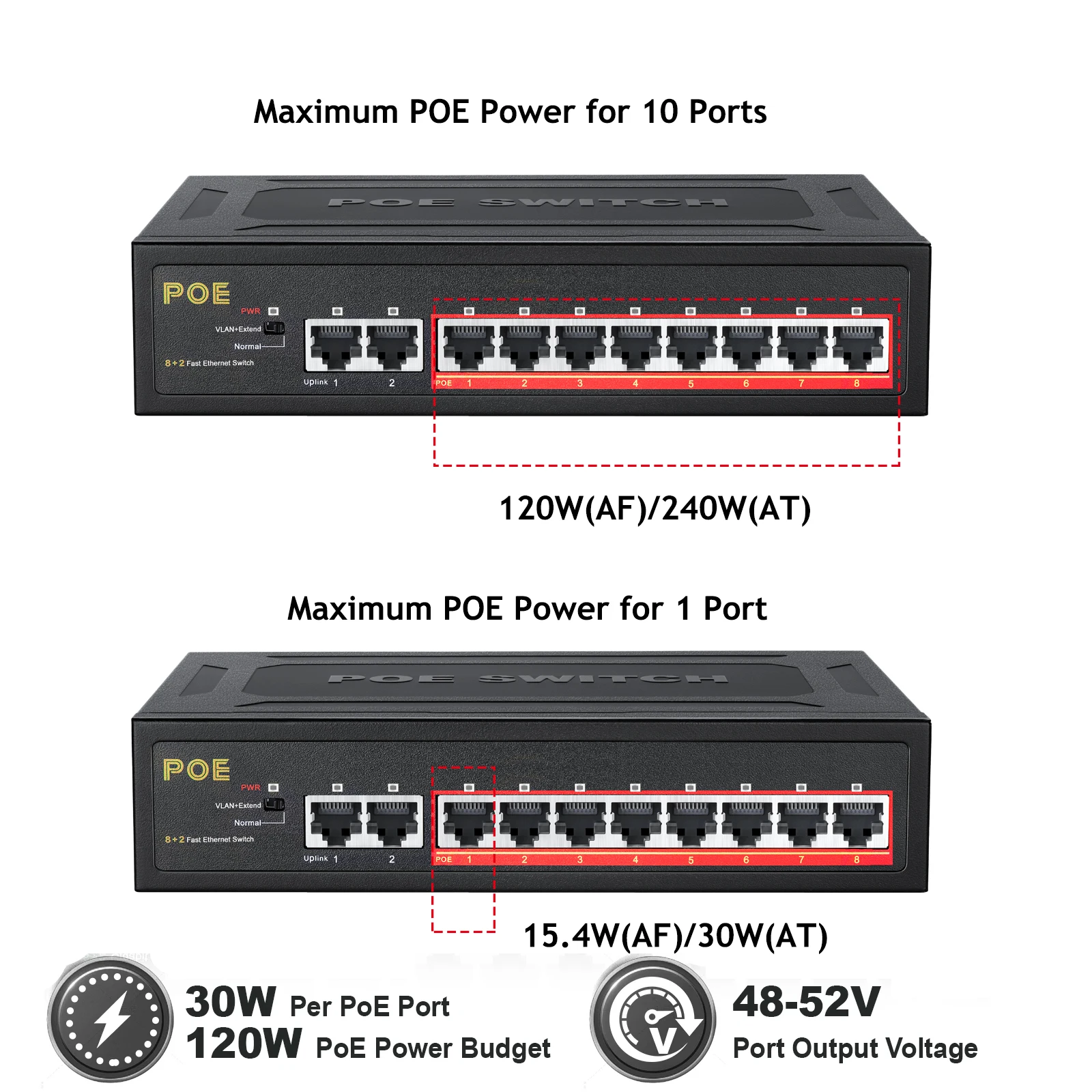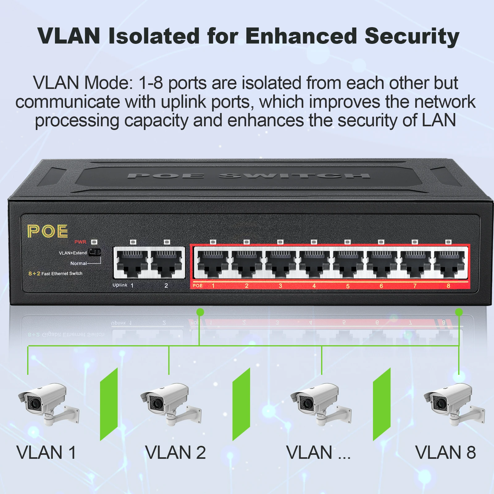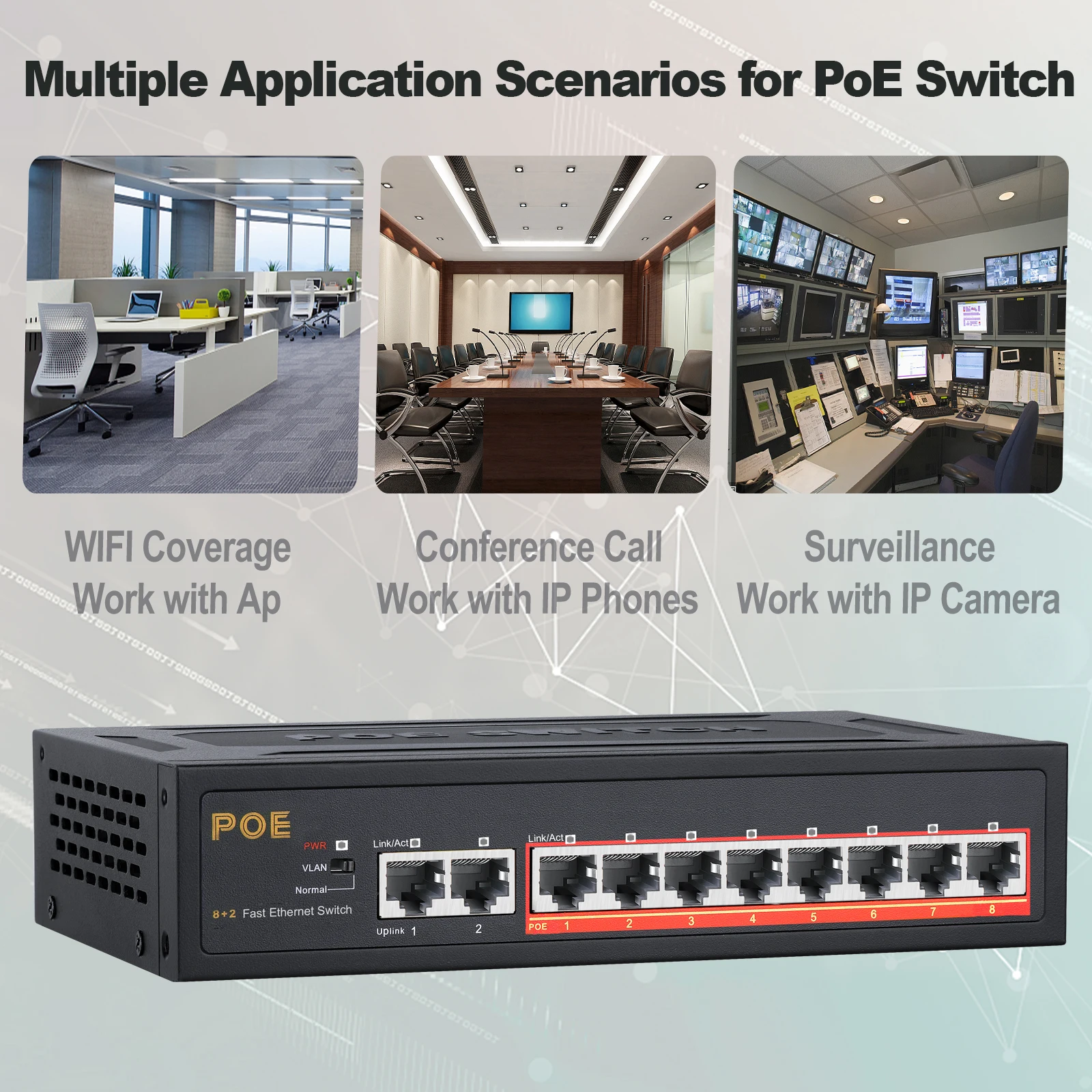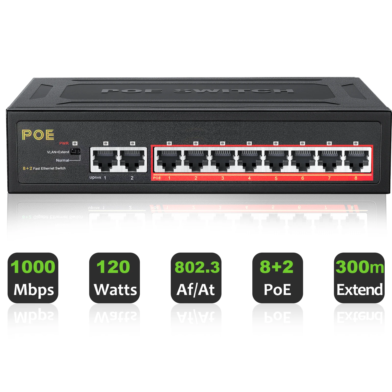 8 портов POE 10/100 Мбит/с + 2 порта восходящего соединения 10/100 Мбит/с