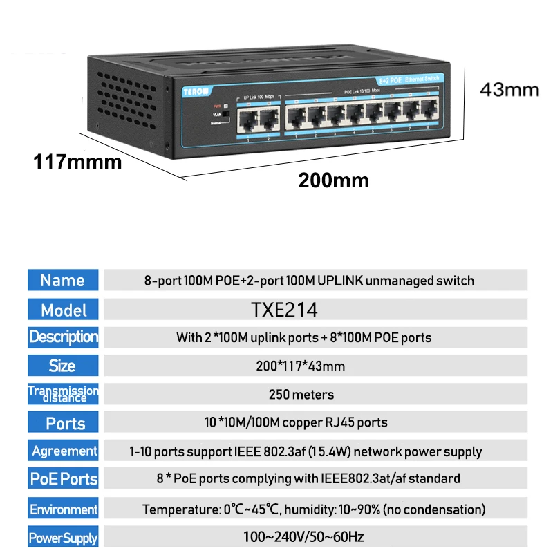 TEROW 10-портовый сетевой коммутатор POE 100 Мбит/с Внутренний источник питания 52 В 93 Вт 8 + 2 Коммутатор Fast Ethernet Изоляция VLAN 250 м IEEE 802.3af/AT