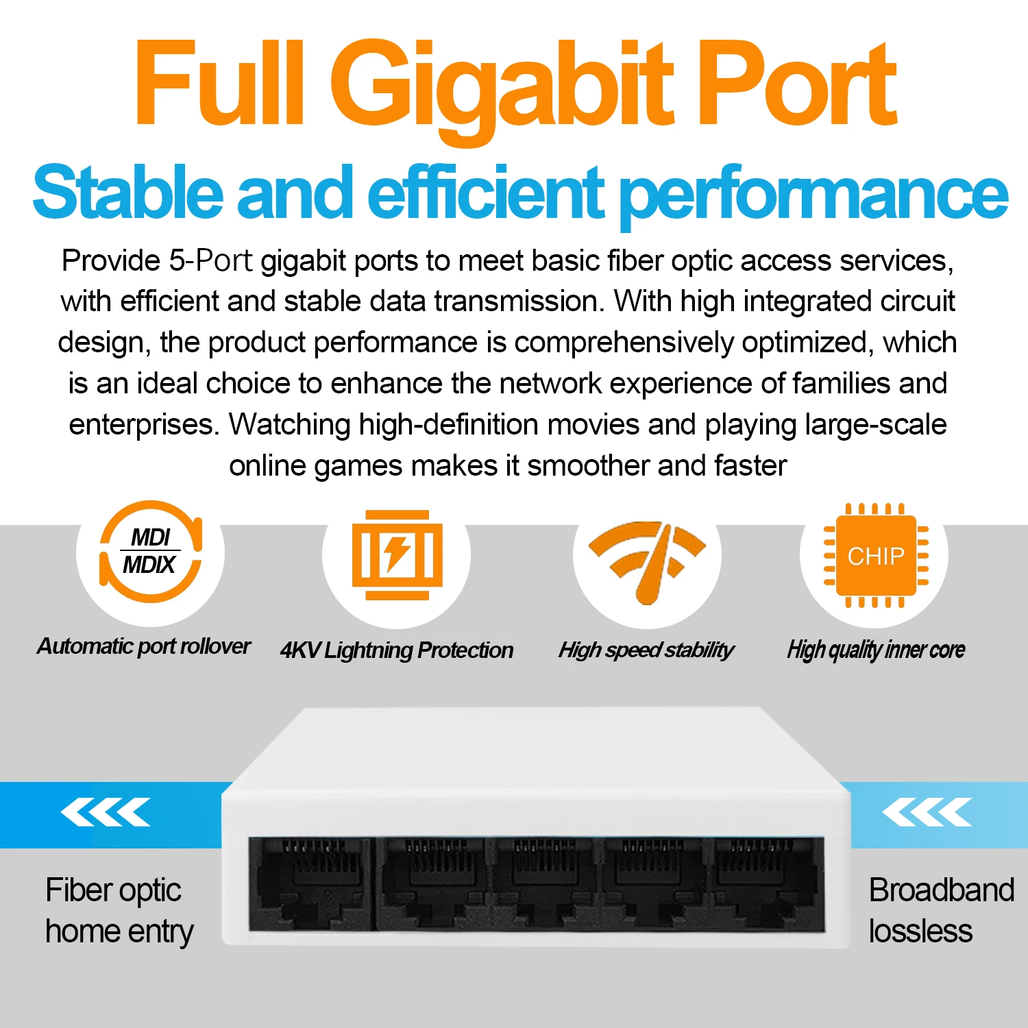 Коммутатор использует конструкцию с высокой интегральной схемой для всесторонней оптимизации производительности продукта, удовлетворения основных услуг доступа к оптоволокну и обеспечения эффективной и стабильной передачи данных. Это идеальный выбор для улучшения онлайн-опыта домов и предприятий. Просмотр фильмов высокой четкости и игра в крупномасштабные онлайн-игры делают его более плавным и быстрым.