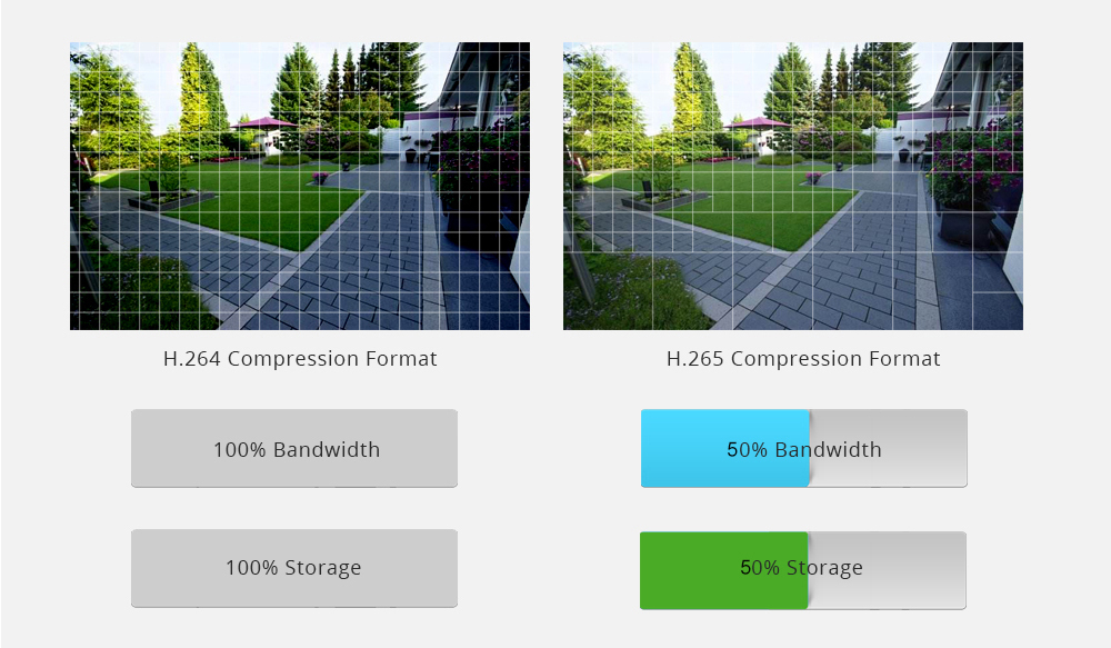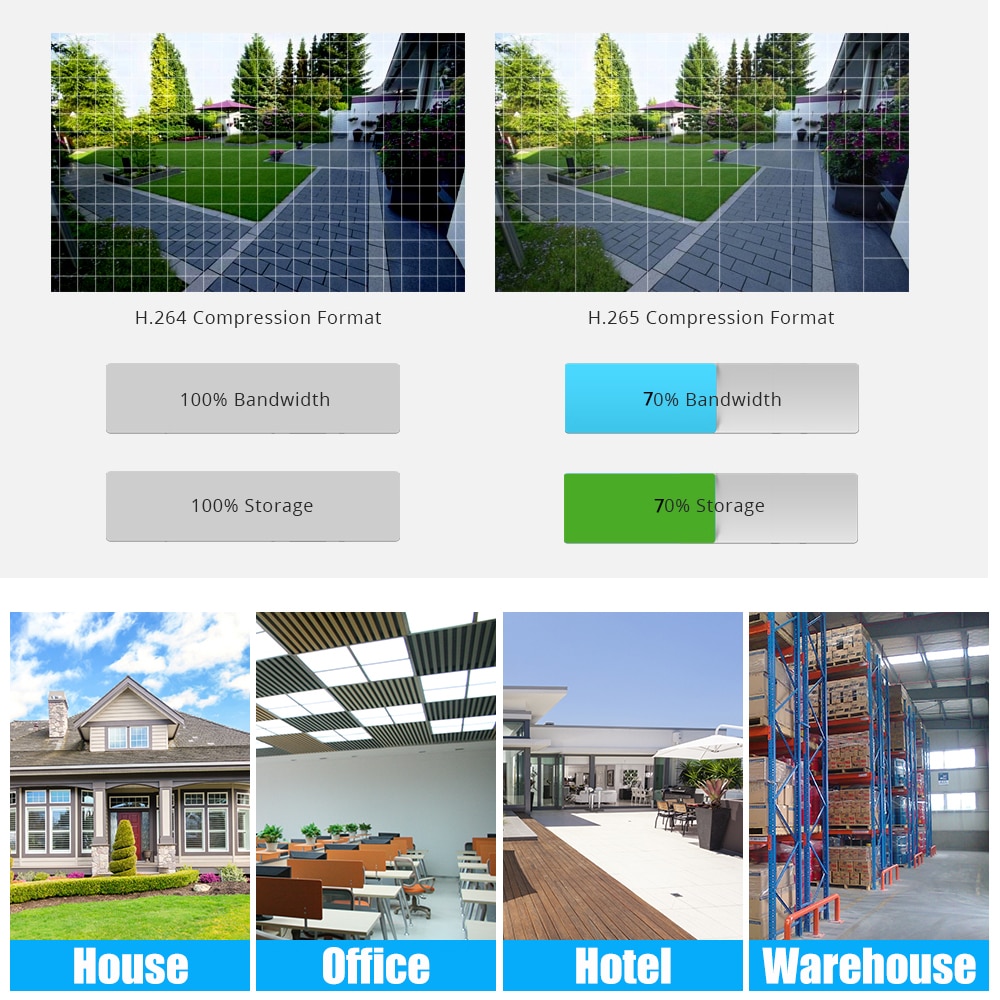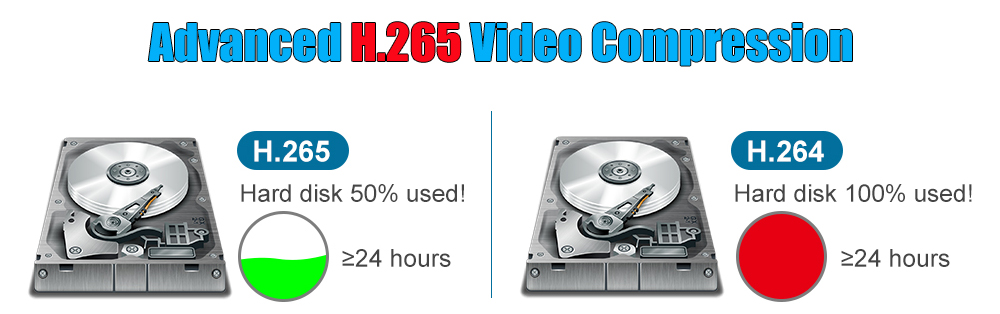 Advanced H.265 + + Video CompressionH.265 (HEVC) удваивает эффективность кодирования по сравнению с его предыдущей H.264. Это означает, что H.265 + + видео экономит около 70% битов при том же качестве кодирования.