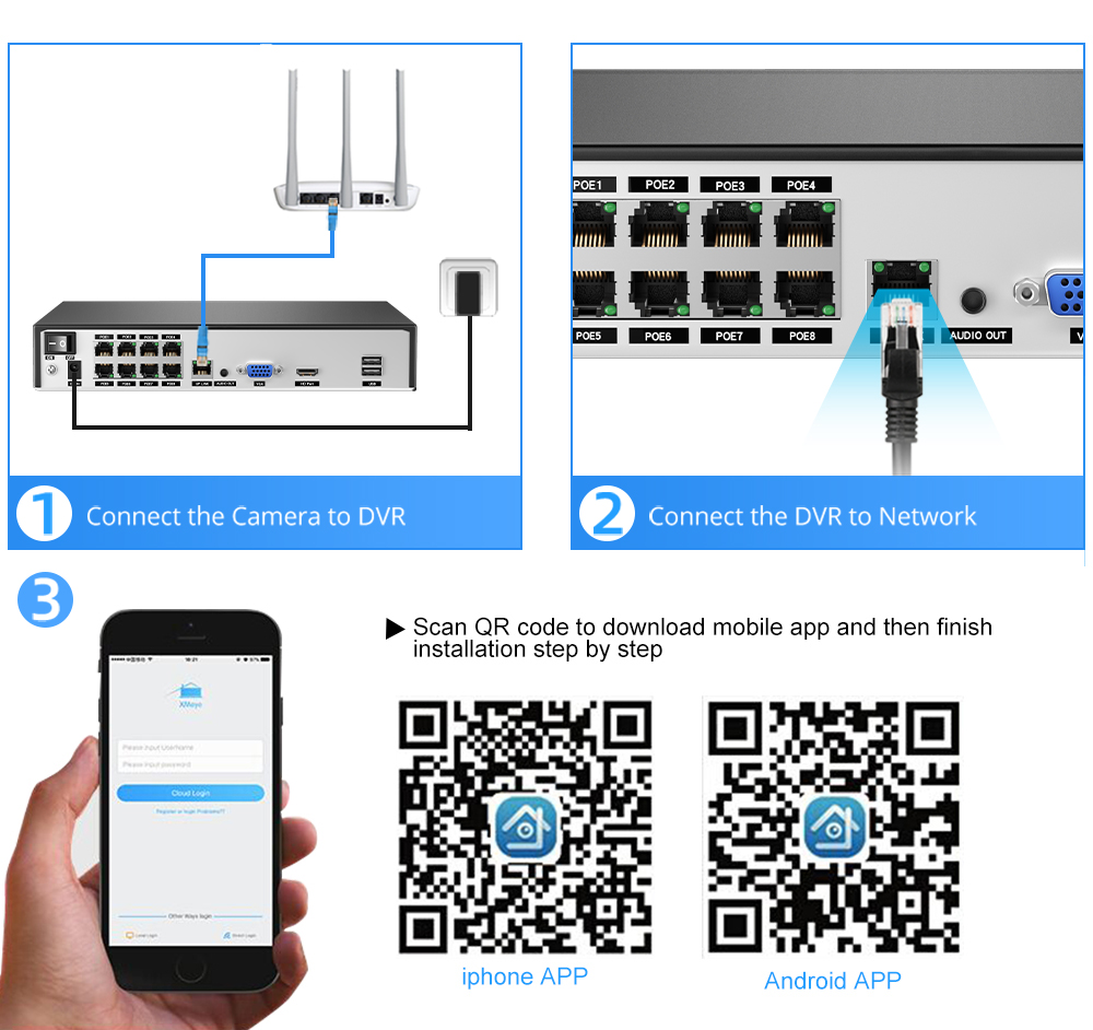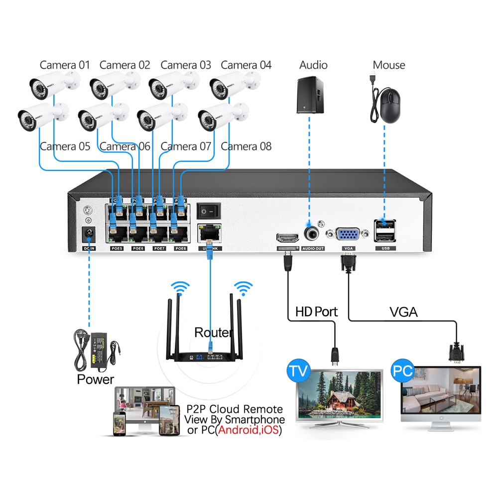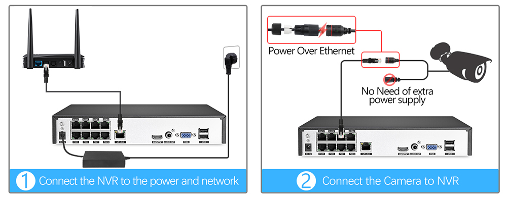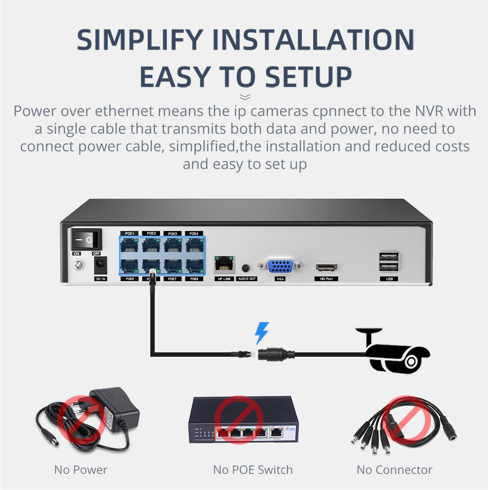 Наш 8-канальный сетевой видеорегистратор POE может достигать 16 каналов, поэтому вы можете подключить максимум 16 камер с помощью переключателя POE. Другой сетевой видеорегистратор поддерживает только 8 каналов макс.