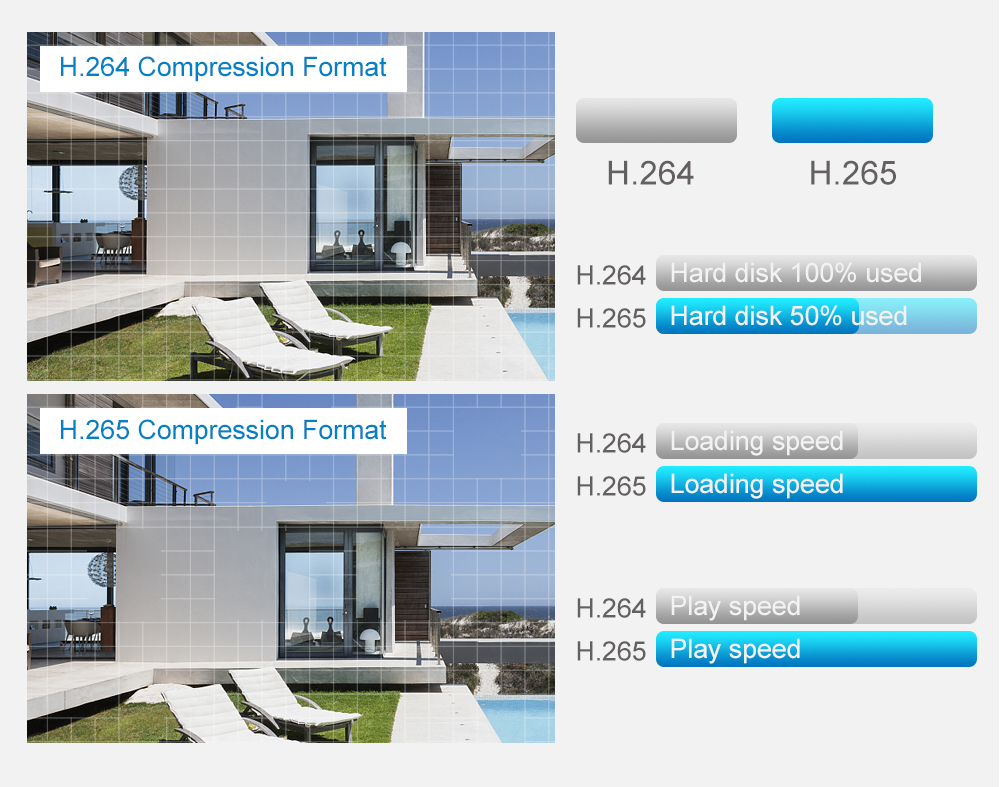 H.265 нужна только более низкая пропускная способность, скорость загрузки быстрее, более плавное воспроизведение видео