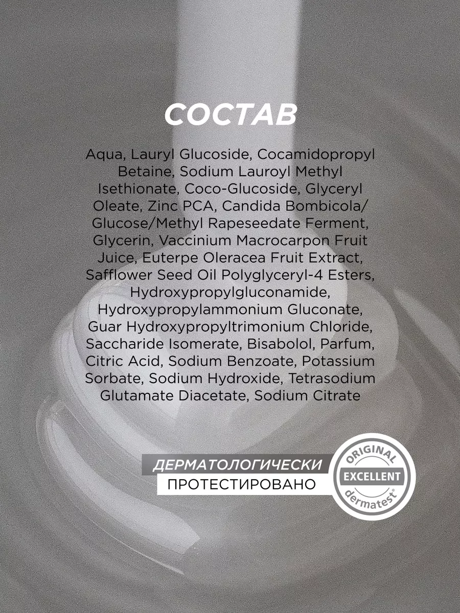 Артикул 90955709 Состав Aqua, Lauryl Glucoside, Cocamidopropyl Betaine, Sodium Lauroyl Methyl Isethionate; Coco-Glucoside, Glyceryl Oleate, Zinc PCA; Candida Bombicola/Glucose/Methyl Rapeseedate Ferment; Glycerin, Vaccinium Macrocarpon Fruit Juice; Euterpe Oleracea Fruit Extract