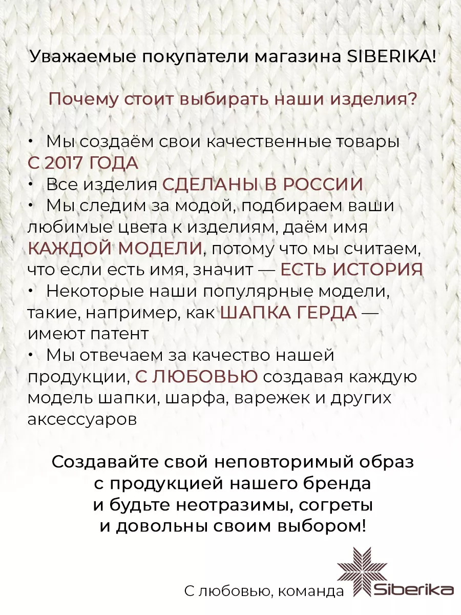 Описание: Добро пожаловать в стильный мир головных уборов известного производителя вязаных аксессуаров в России Siberika! Предлагаем вам самую популярную и трендовую модель Герда шапка женская бини вязаная без отворота, которая полюбилась многим представительницам прекрасного пола. Зимняя шерстяная шапка beanie с высокой макушкой имеет декоративную шлицу сзади, которая придает изюминку данной модели. Благодаря разрезу шапочка комфортно облегает голову, не сдавливая ее и не приминая прическу. Шапка женская тонкая, при этом достаточно плотная выполнена из мягкой полушерстяной пряжи. В состав входит акрил, за счет чего вязаное изделие не растягивается и сохраняет форму. Шапка луковка без подворота одинарная благодаря плотной крупной вязке и уникальной технологии производства станет идеальным выбором для теплой зимы, в осеннюю или весеннюю погоду и в демисезон. Модную демисезонную шапку лапша можно носить с глубокой посадкой или свободнее торчком. Вязанная шапка весна-осень подойдет взрослым женщинам, девушкам, девочкам подросткам, всем кто желает выглядеть стильно и лаконично. Подростковая молодежная шапка-бини тыковка в модном бордовом цвете - это стиль и качество, которые выбирают тысячи наших покупателей. Коллекция брендовых шапок весна осень зима расширена многообразием вязаных аксессуаров, благодаря чему легко подобрать стильный комплект. Теплый уютный набор шапки со снудом, шарфом и варежками станут практичным подарком для любимых и близких на день рождения или новый год, на 14 февраля или просто без повода в знак заботы и внимания. Выбирайте уникальный и стильный головной убор премиум-качества от производителя по доступным ценам и наслаждайтесь максимальным комфортом. Заходите, заказывайте, носите с удовольствием! Связано с Любовью - Siberika!