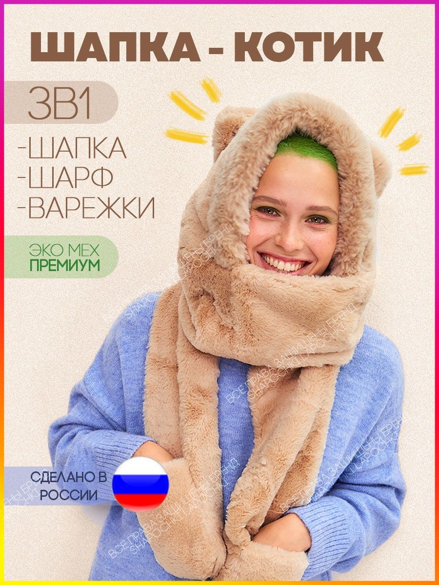 шапка женская зимняя меховая комплект шарф снуд варежки