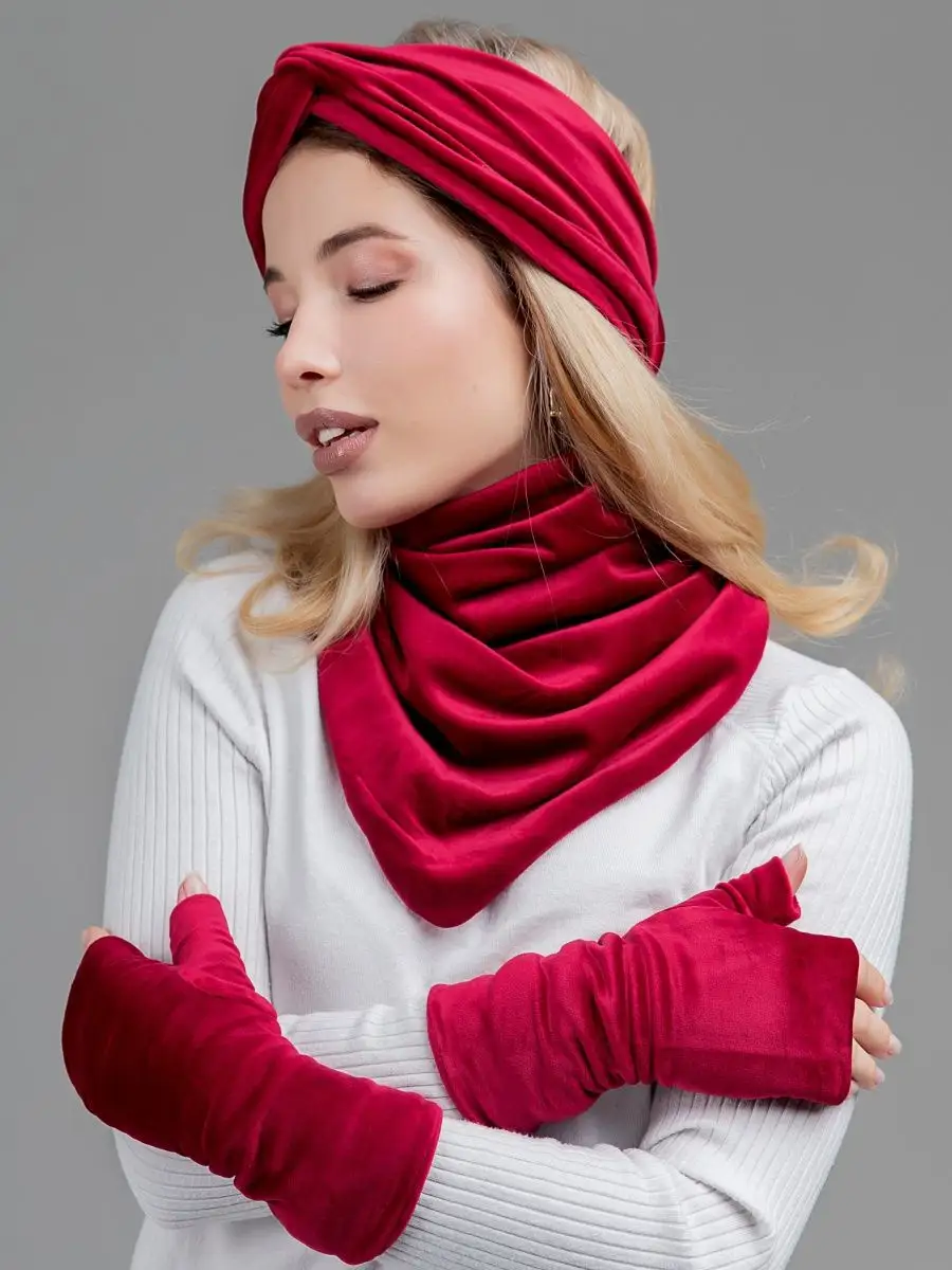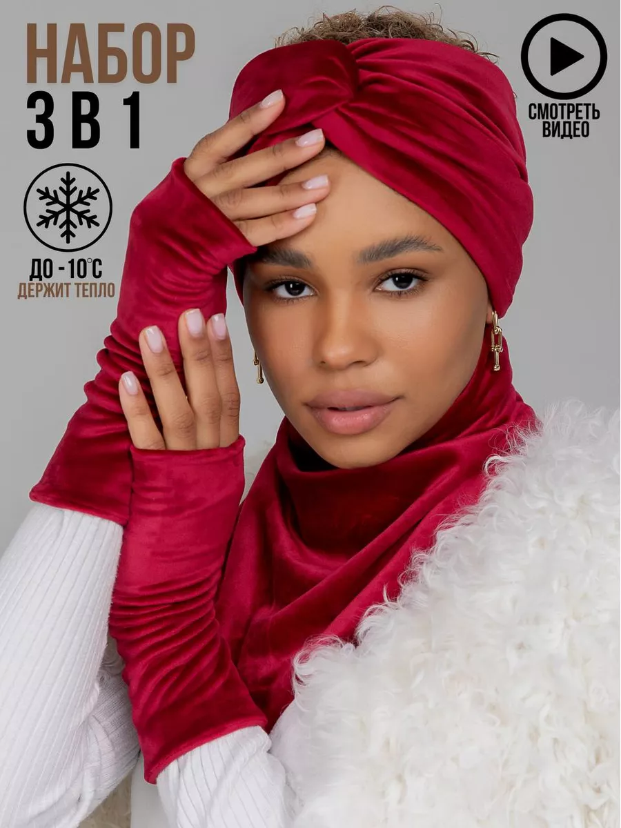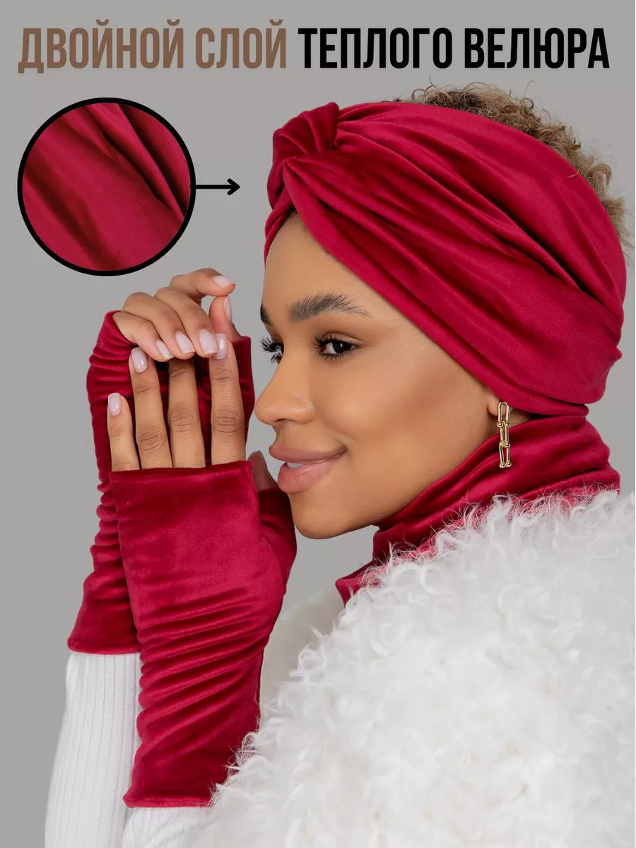 Описание: Комплект зимний - это набор стильных аксессуаров (шапка повязка на голову женская, манишка, перчатки - митенки), который будет согревать Вас, и дарить тепло и уют, начиная с конца сентября и до первых теплых весенних дней.Комплект аксессуаров российского бренда Sweet Cold избавит вас от рутины шопинга и необходимости подбирать каждый элемент отдельно и думать о том, сочетается ли повязка с перчатками, подойдет ли шарф под пальто или куртку, насколько хорошо будут смотреться перчатки с другими, уже имеющимися аксессуарами.Наш великолепный велюровый набор состоит из трех самых главных элементов, которые нужны каждой современной женщине, чтобы оставаться в тепле и комфорте осенью и зимой.Первый элемент из комплекта - повязки на голову для женщин.Повязка для головы станет не просто обычным головным убором, а прекрасным дополнением к вашей прическе. Такая теплая повязка на голову - это возможность сохранить голову в тепле с любой прической: будь то высокий хвост или аккуратный пучок. Повязки на голову обеспечивают сохранность вашей укладки. Вам не нужно будет снова искать компромиссы: замерзнуть без шапки, но остаться с укладкой, или испортить тщательно уложенные волосы плотной шапкой, но остаться в тепле. Повязка на уши защитит лоб и уши от ветра и холода и при этом спасет плотные локоны и работу утюжка для волос.Второй элемент из комплекта - перчатки. Перчатки митенки женские выполнены из той же, ткани, что и другие элементы комплекта. Варежки без пальцев идеально садятся на хрупкую женскую руку, не тянут в швах между пальцами, не доставляют дискомфорт в ладони. Это не простые перчатки, а модные митенки длинные - стильные перчатки с открытыми пальцами. В них всегда будет удобно воспользоваться телефоном на улице, застегнуть пуговицу или молнию на верхней одежде поправить сережку или открыть сумочку, не снимая их с руки. Перчатки митенки - это, с одной стороны, дополнительное удобство и функциональность, а с другой стороны, - возможность продемонстрировать окружающим идеальный маникюр и украшения. Такие рукава митенки можно встроить в образ и даже не снимать в помещении, дополнив ими образ, например, с объемным джемпером или пуловером оверсайз.Третий элемент набора - это снуд манишка. Невероятно мягкий шарф женский обеспечит комфорт и тепло вашей шее в любую непогоду и ненастье. Шарф платок не будет создавать дополнительный объем в зоне лица и не испортит макияж. Манишка женская смотрится невероятно изящно и очень женственно. Шарф воротник станет настоящей палочкой-выручалочкой, если вам захочется надеть джемпер без горла или блузку с вырезом в прохладную погоду. Самое главное, что вам не нужно заботиться о том, как красиво повязать шарф на шею. Наши манишки для женщин сшиты таким образом, что образуют красивые ниспадающие складки. Манишки Sweet Cold совершенно несложно надеть - просто накиньте его через голову, и ваш идеальный шарфик женский готов!Демисезонный комплект выполнен из мягчайшего велюра, приятного к телу. Материал, который не электризуется, не колется, не раздражает кожу. Бархатистая поверхность смотрится дорого и роскошно, на ней не остается катышков и затяжек, ткань не выцветает и не садится даже после многократных стирок, нежные ворсинки не вылезают и не осыпаются. Все элементы, входящие в зимний комплект, выполн
